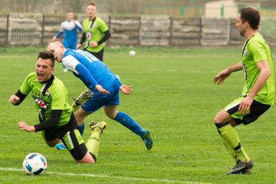 Artur Bańka (na zdjęciu z prawej) walczy o piłkę z Krzysztofem Pietluchem z Wólczanki Wólka Pełkińska. Teraz będą klubowymi kolegami.
