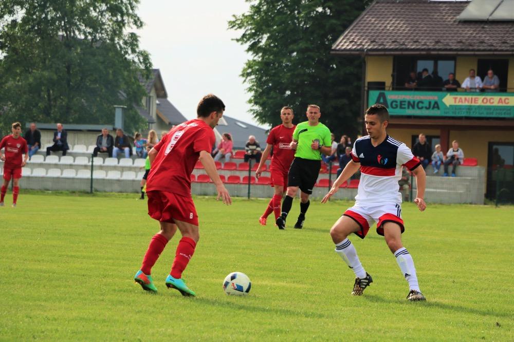 Goście wyszli na prowadzenie w 21. minucie spotkania po trafieniu Karola Adamiaka z rzutu karnego. Do przerwy LKS Pisarowce wygrywał w Nowej Dębie 1-0.