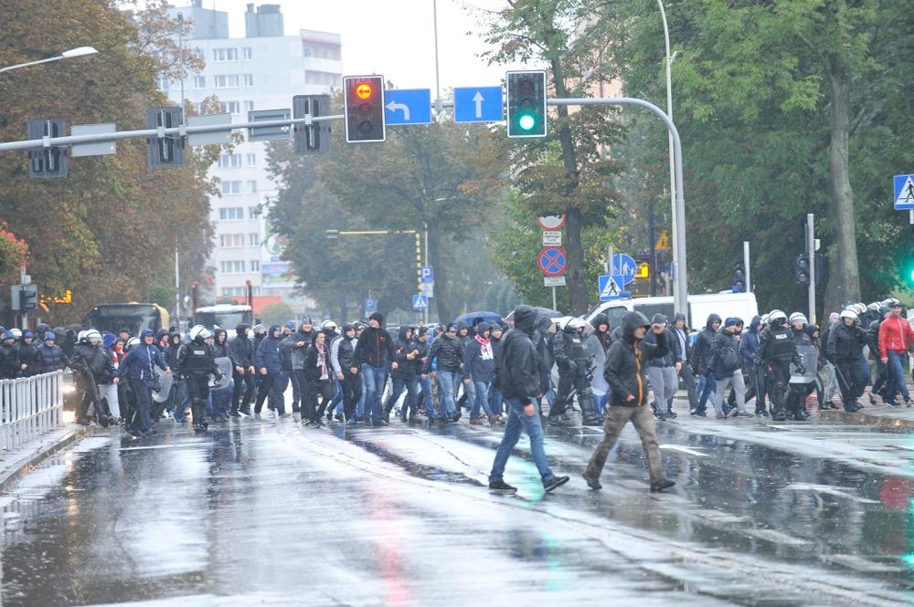 Pochód kibiców Resovii w drodze na 81. Derby Rzeszowa ze Stalą Rzeszów, które odbyły się w środę 12 października na Stadionie Miejskim.