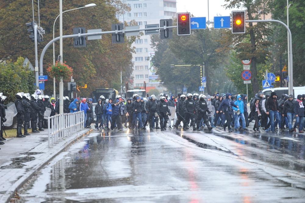 - 81. Derby Rzeszowa pomiędzy Stalą Rzeszów a Resovią. Na zdjęciach pochód kibiców Resovii w drodze na derby.