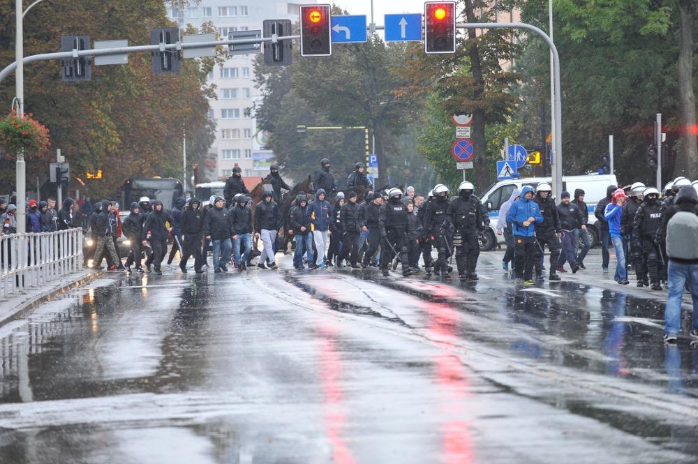 Pochód kibiców Resovii w drodze na 81. Derby Rzeszowa ze Stalą Rzeszów, które odbyły się w środę 12 października na Stadionie Miejskim.