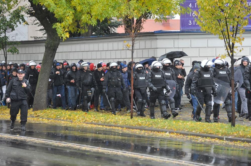 Pochód kibiców Resovii w drodze na 81. Derby Rzeszowa ze Stalą Rzeszów, które odbyły się w środę 12 października na Stadionie Miejskim.