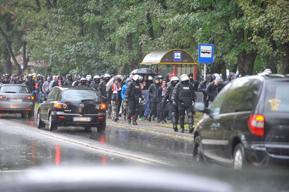 Pochód kibiców Resovii w drodze na 81. Derby Rzeszowa ze Stalą Rzeszów, które odbyły się w środę 12 października na Stadionie Miejskim.