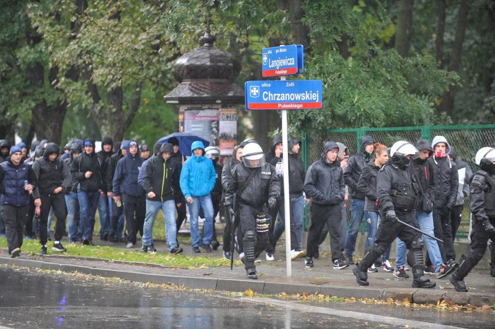 Pochód kibiców Resovii w drodze na 81. Derby Rzeszowa ze Stalą Rzeszów, które odbyły się w środę 12 października na Stadionie Miejskim.