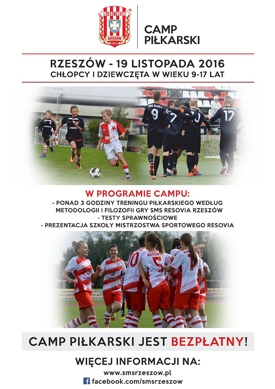 Szkoła Mistrzostwa Sportowego Resovia organizuje camp piłkarski dla dziewcząt i chłopców w wieku od 9 do 17 lat. Obóz odbędzie się 19 listopada 2016 roku.