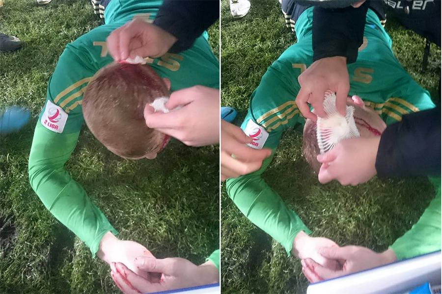 Rozcięta głowa Adriana Gębalskiego (fot. facebook.com / Stal Stalowa Wola)