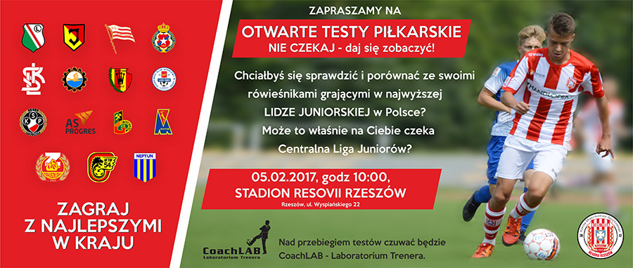 - Chciałbyś się sprawdzić i porównać ze swoimi rówieśnikami grającymi w najwyższej lidze juniorskiej w Polsce? Jesteś uczniem szkoły średniej? Może to właśnie na Ciebie czeka Centralna Liga Juniorów? Nie czekaj. Daj się zobaczyć podczas otwartych testów piłkarskich - zachęcają działacze Resovii.