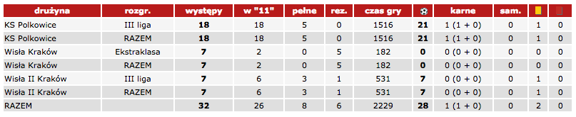 Grał wprawdzie w większości w trzeciej lidze, ale jego skuteczność w ubiegłym sezonie jest imponująca. We wszystkich ligowych rozgrywkach zaliczył łącznie 32 spotkania strzelając aż 28 goli. Jego statystyki możecie zobaczyć na poniższym zestawieniu pochodzącym z serwisu 90minut.pl.