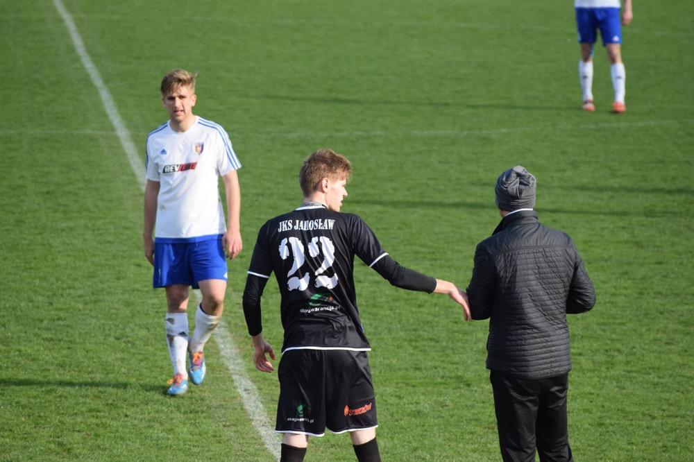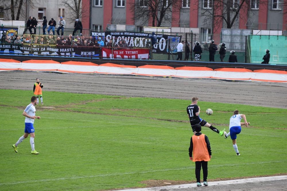 - Karpaty Krosno (biało-niebieskie stroje) zremisowały u siebie z JKS-em Jarosław w meczu 3 ligi grupy IV (fot. Dominik Budzowski)