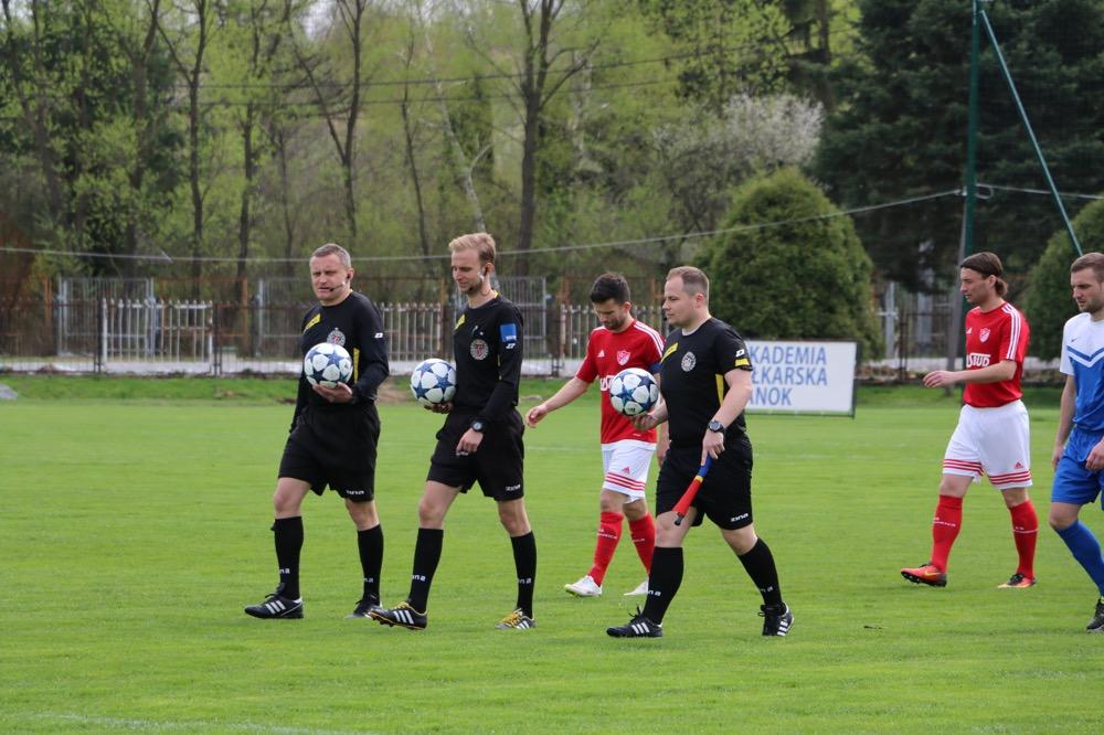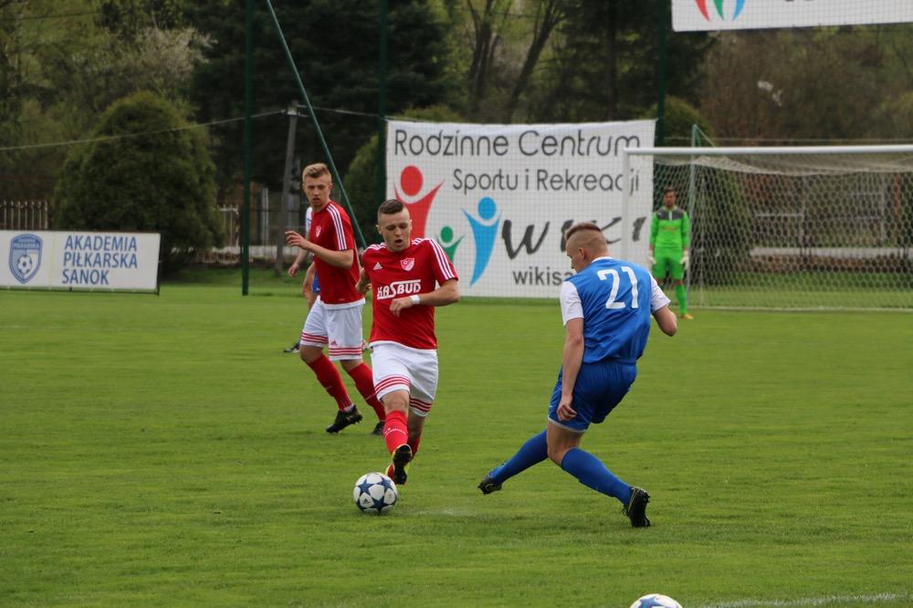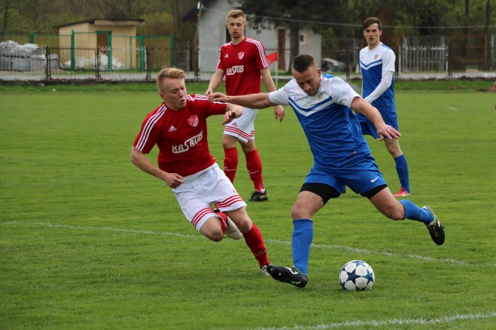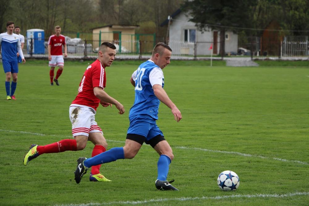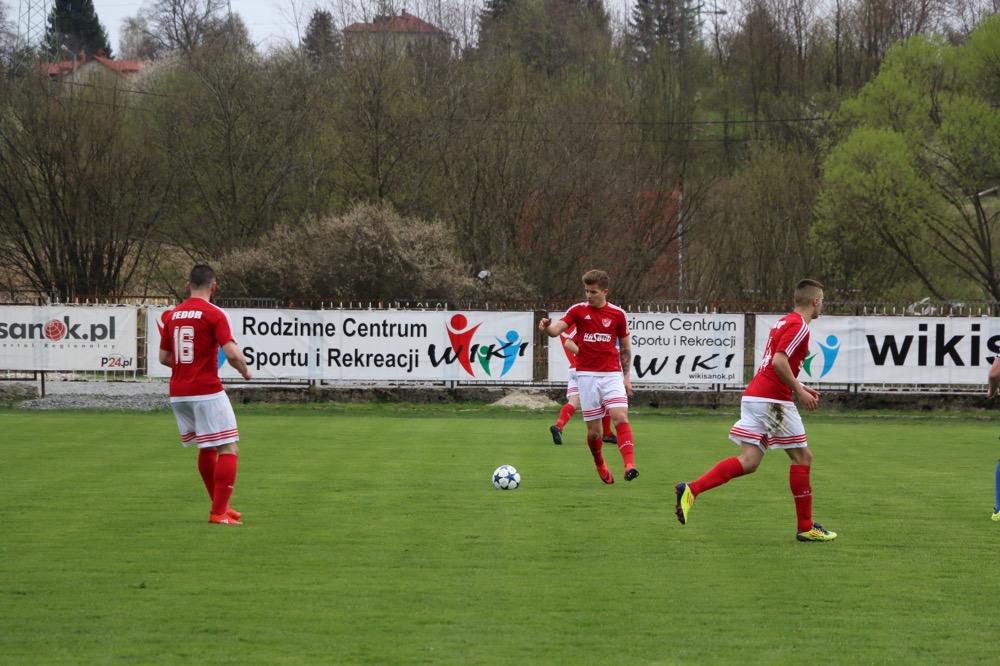 - KS Wiązownica (czerwono-białe stroje) zwyciężył 4-1 w sobotnim wyjazdowym meczu 4 ligi podkarpackiej z LKS-em Pisarowce (fot. Natalia Styś)