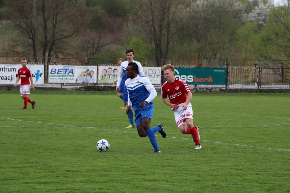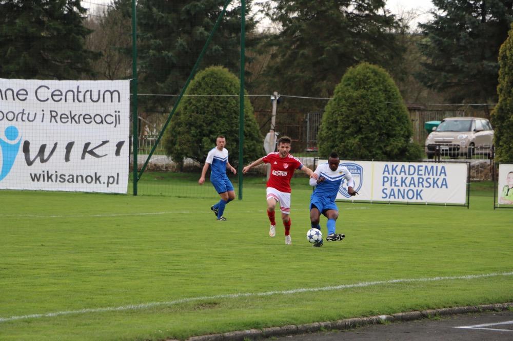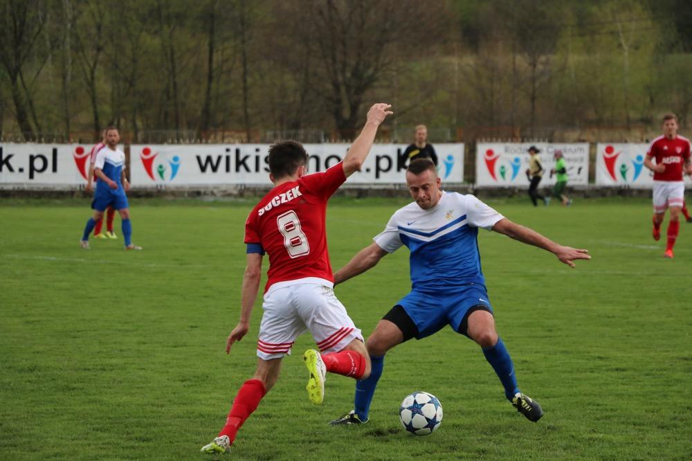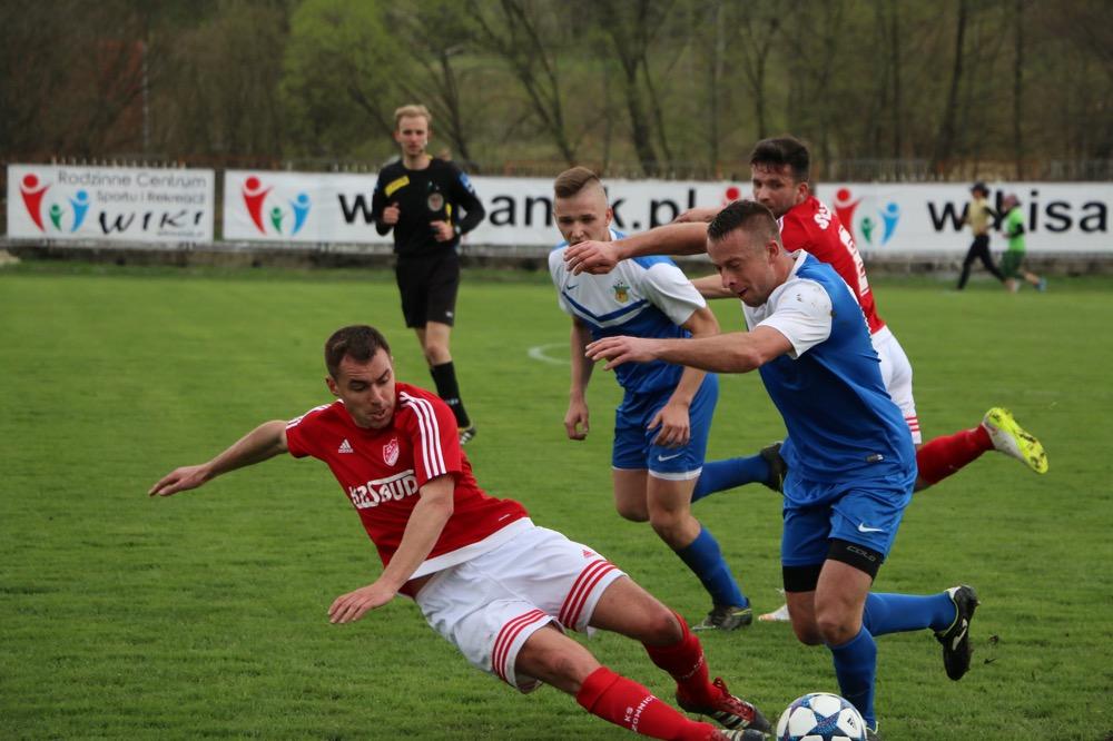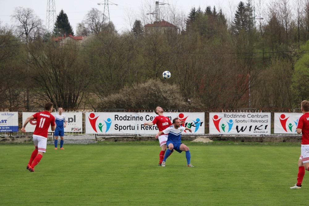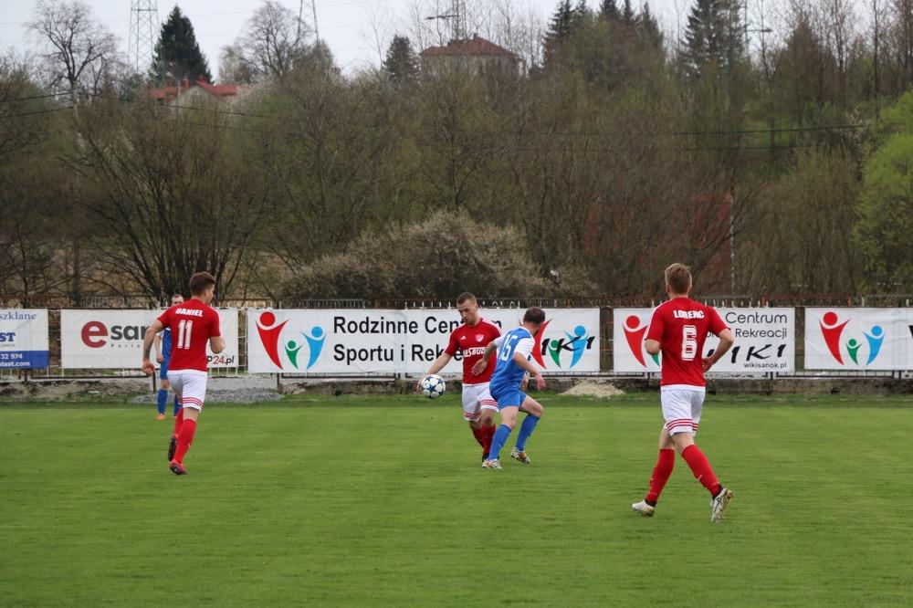 - KS Wiązownica (czerwono-białe stroje) zwyciężył 4-1 w sobotnim wyjazdowym meczu 4 ligi podkarpackiej z LKS-em Pisarowce (fot. Natalia Styś)