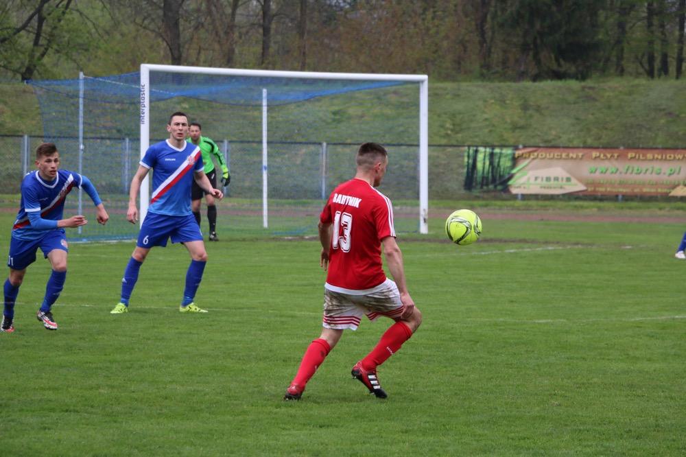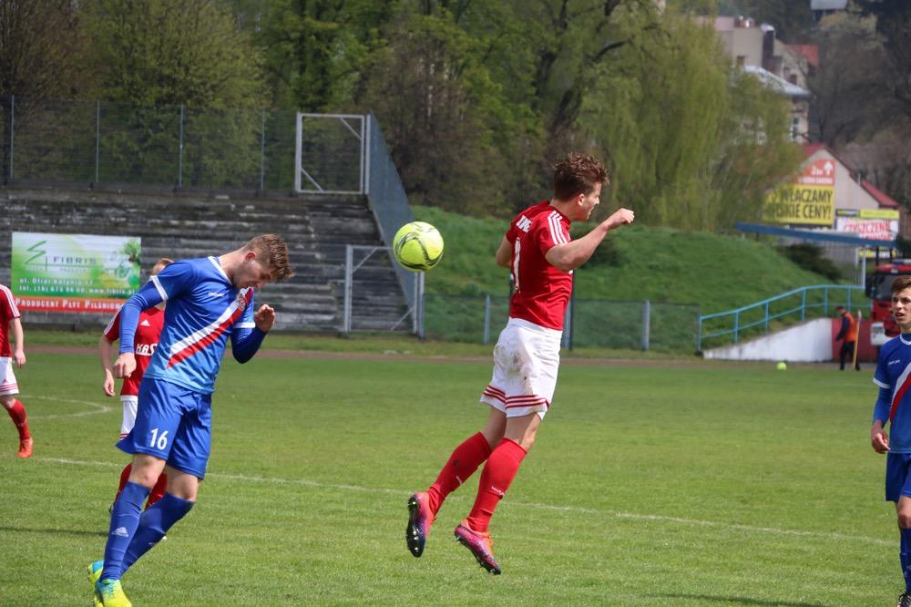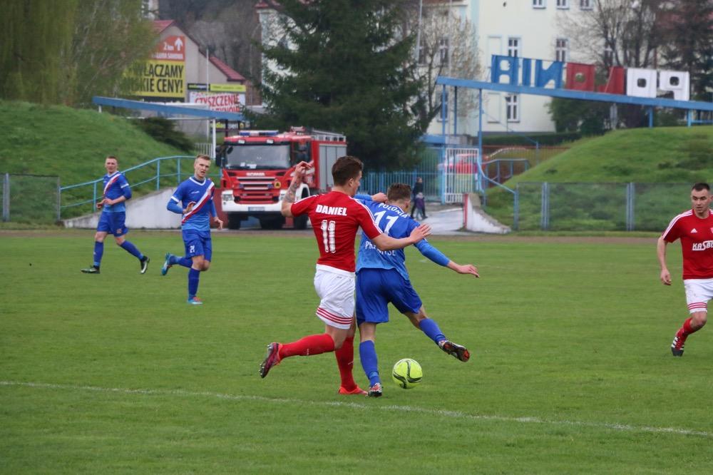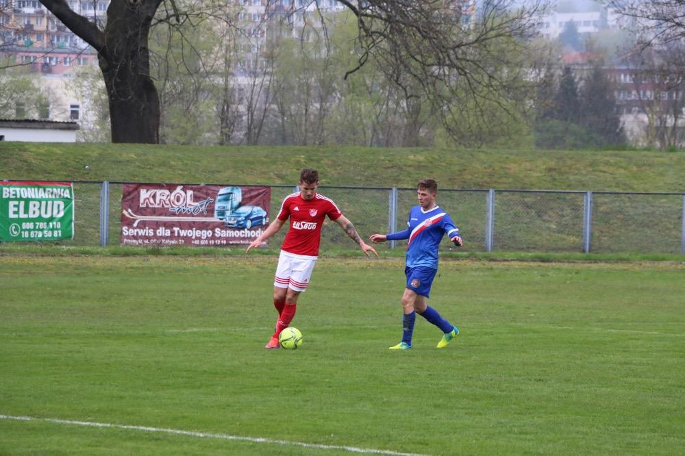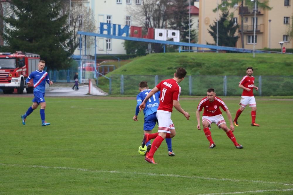 - 22.04.2017, sobota: piłkarze Polonii Przemyśl (niebiesko-czerwone stroje) wygrali 3-0 z KS-em Wiązownica w meczu 4 ligi podkarpackiej (fot. Natalia Styś)