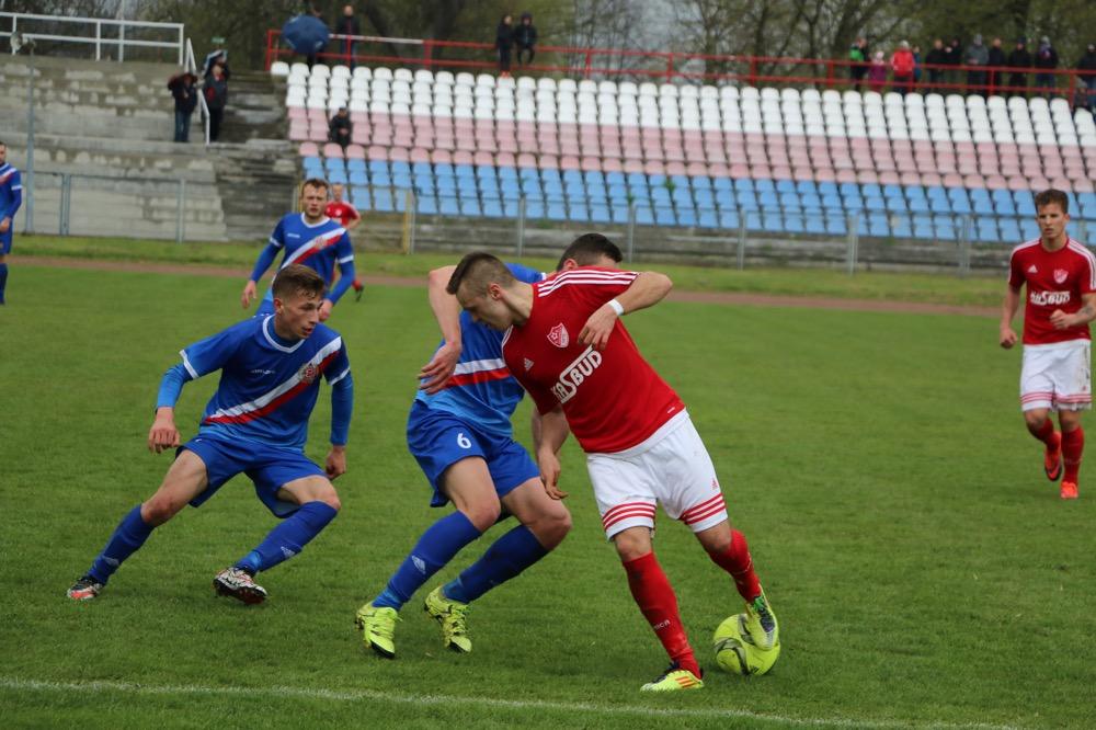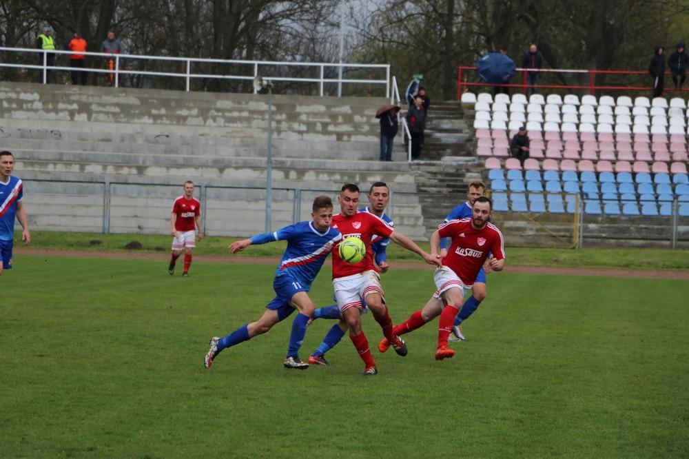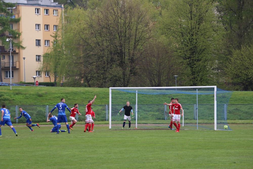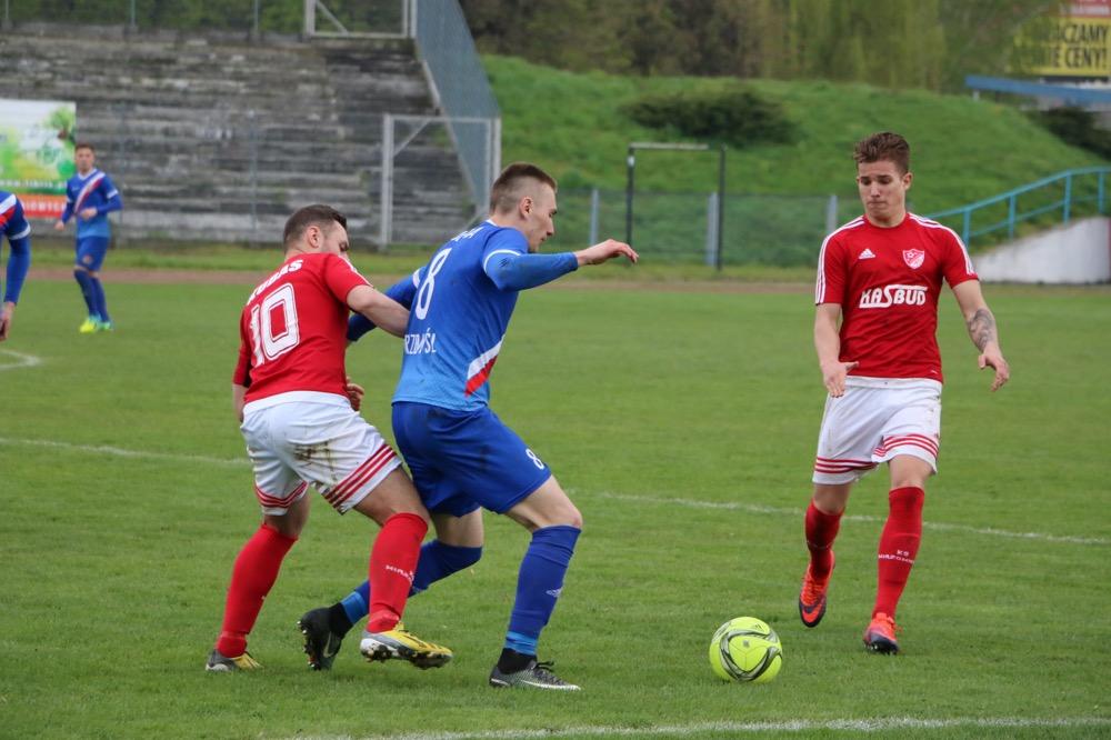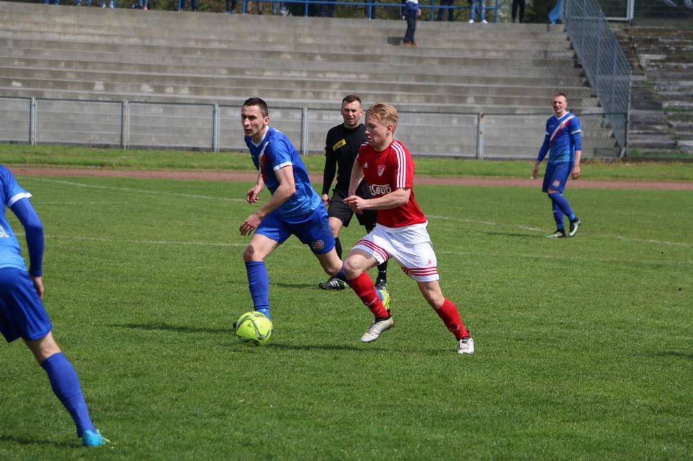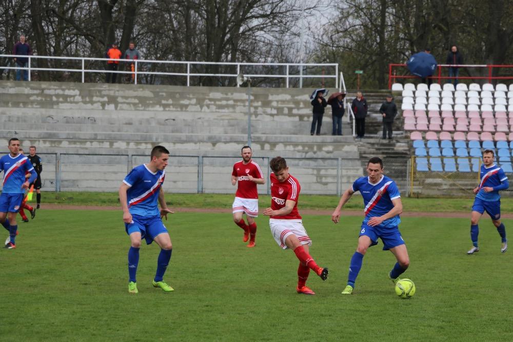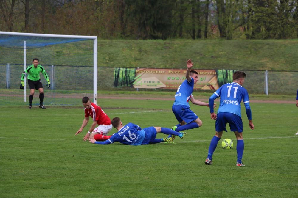 - 22.04.2017, sobota: piłkarze Polonii Przemyśl (niebiesko-czerwone stroje) wygrali 3-0 z KS-em Wiązownica w meczu 4 ligi podkarpackiej (fot. Natalia Styś)