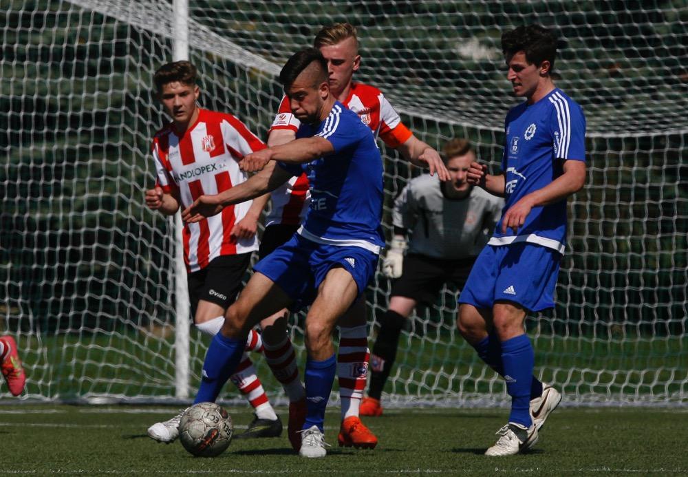 Fabian Bober na zdjęciu z piłką w barwach Stali Mielec CLJ.