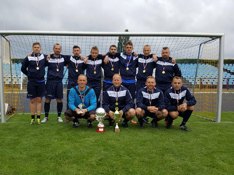 Witold Kwaśny (pierwszy na dole po lewej) świętuje wraz z kolegami Mistrzostwo Polski Urzędów Wojewódzkich