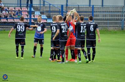Na zdjęciu w środku Krzysztof Zawiślak, strzelec jednej z bramek dla JKS-u Jarosław (fot. Dominik Budzowski / Klub 100 - JKS Jarosław)