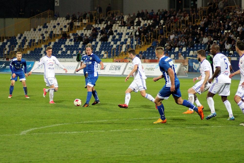 - Mielec, 11.04.2018: Piłkarze Stali Mielec (białe stroje) zremisowali 1-1 z Miedzią Legnica w meczu 1 ligi (fot. Radek Kuśmierz)