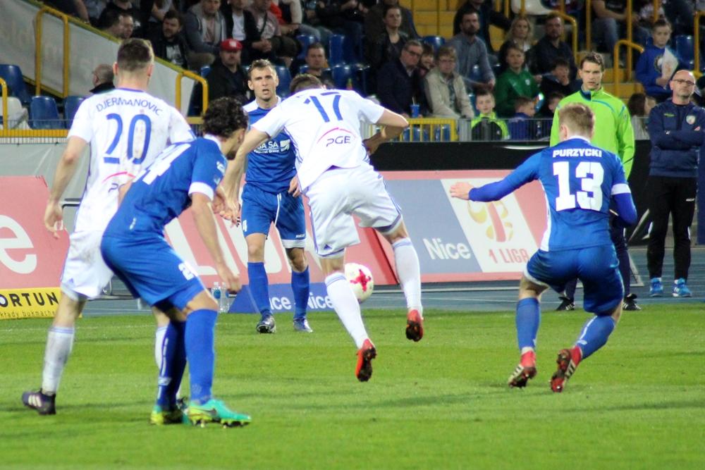 - Mielec, 11.04.2018: Piłkarze Stali Mielec (białe stroje) zremisowali 1-1 z Miedzią Legnica w meczu 1 ligi (fot. Radek Kuśmierz)