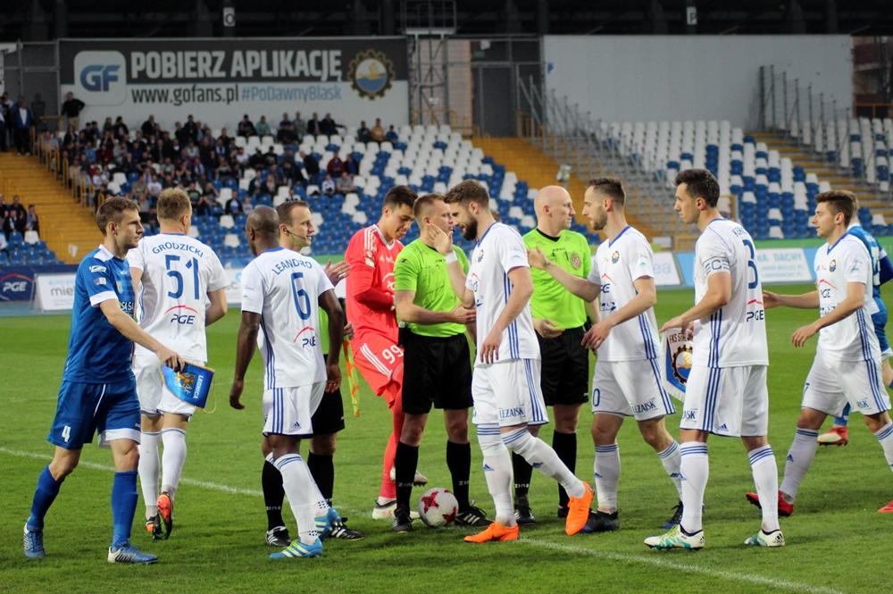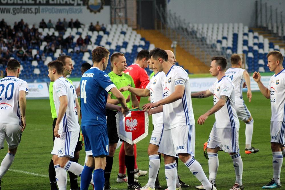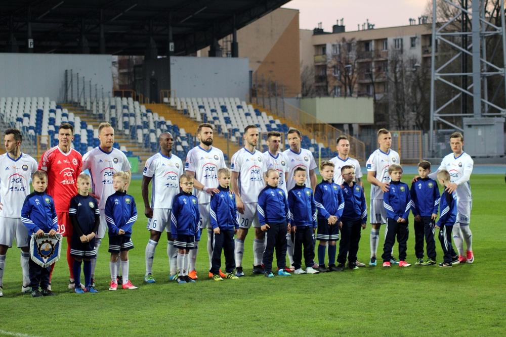 - Mielec, 11.04.2018: Piłkarze Stali Mielec (białe stroje) zremisowali 1-1 z Miedzią Legnica w meczu 1 ligi (fot. Radek Kuśmierz)