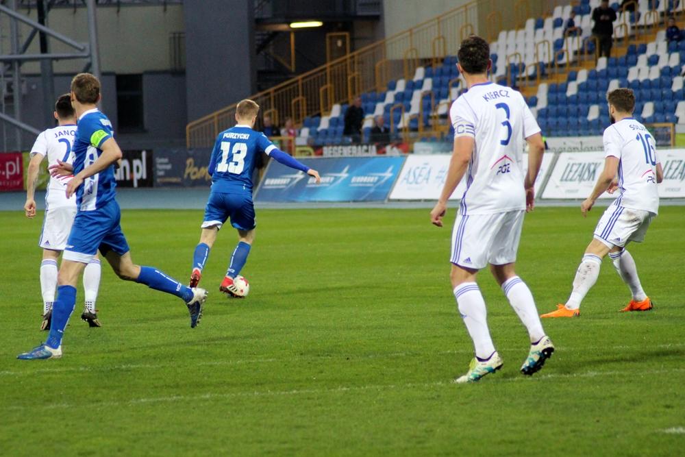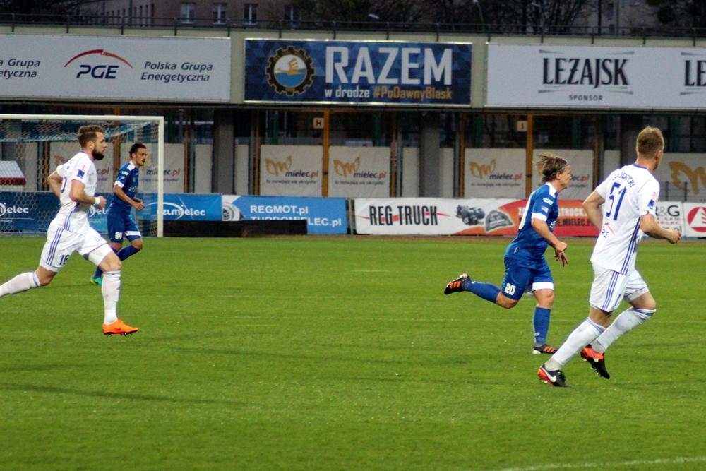 - Mielec, 11.04.2018: Piłkarze Stali Mielec (białe stroje) zremisowali 1-1 z Miedzią Legnica w meczu 1 ligi (fot. Radek Kuśmierz)