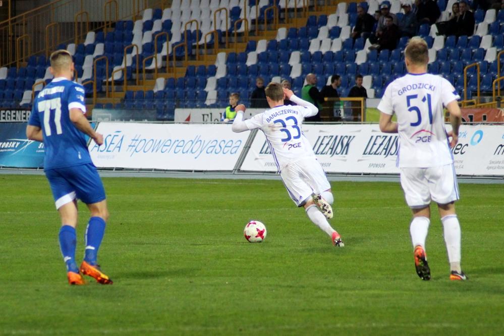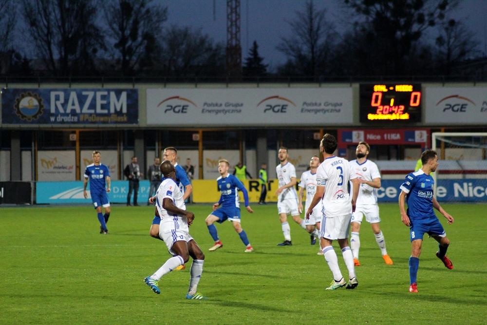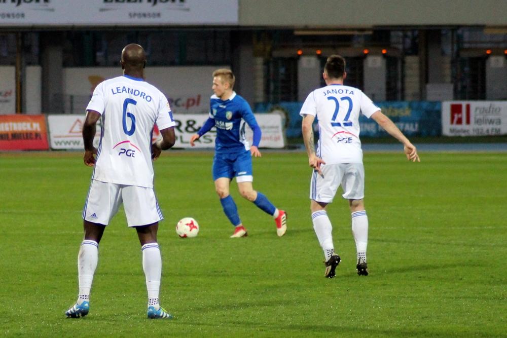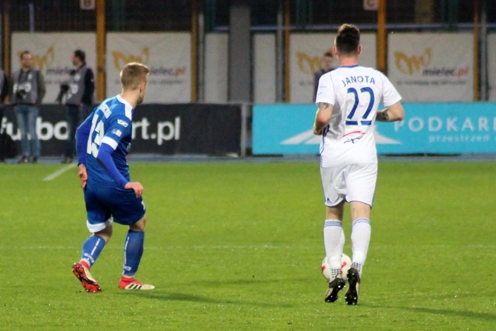 - Mielec, 11.04.2018: Piłkarze Stali Mielec (białe stroje) zremisowali 1-1 z Miedzią Legnica w meczu 1 ligi (fot. Radek Kuśmierz)