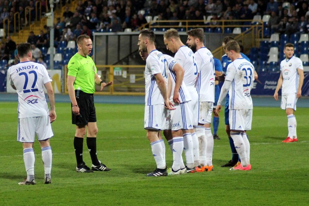- Mielec, 11.04.2018: Piłkarze Stali Mielec (białe stroje) zremisowali 1-1 z Miedzią Legnica w meczu 1 ligi (fot. Radek Kuśmierz)
