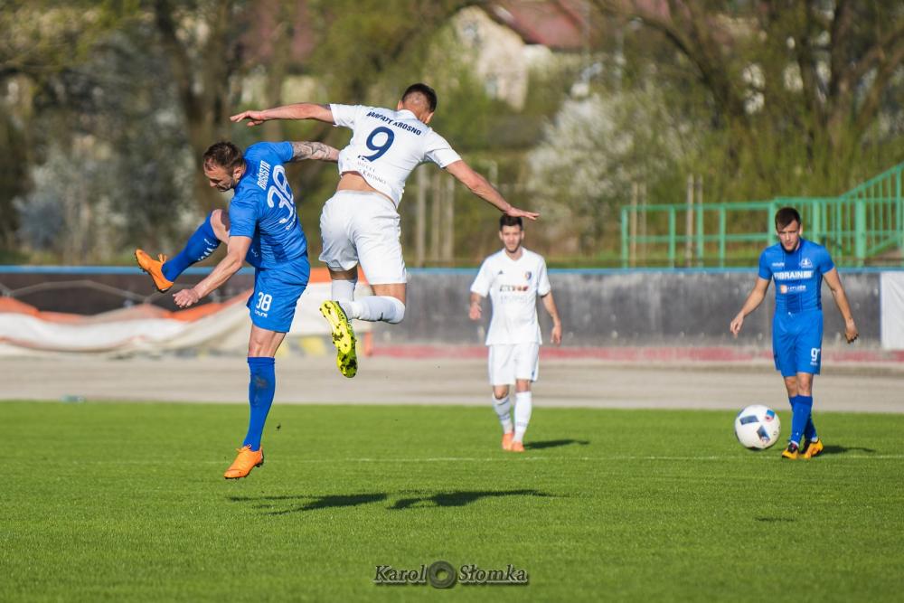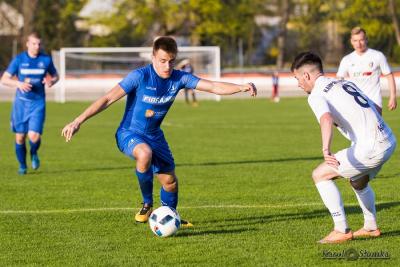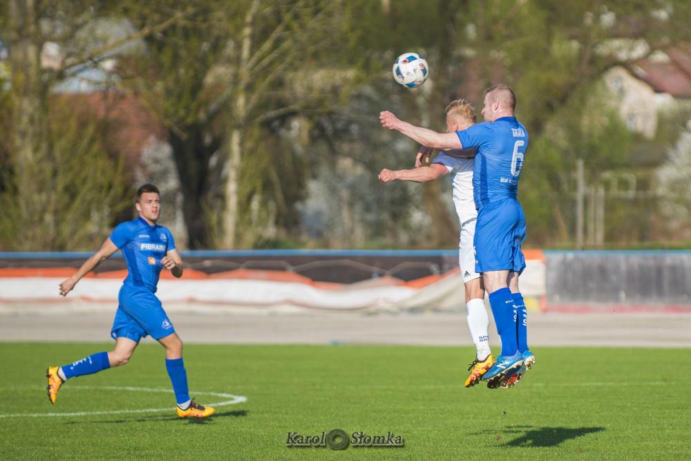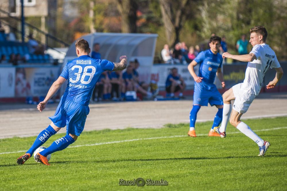 - 14.04.2018, Krosno: Piłkarze Stali Rzeszów (niebieskie stroje) wygrali 2-0 w wyjazdowym pojedynku 3 ligi z Karpatami Krosno. Obydwa gole dla Stali zdobył Kamil Bętkowski (fot. Karol Słomka)