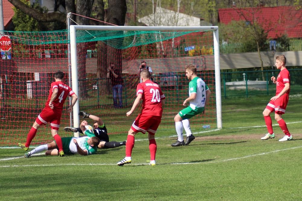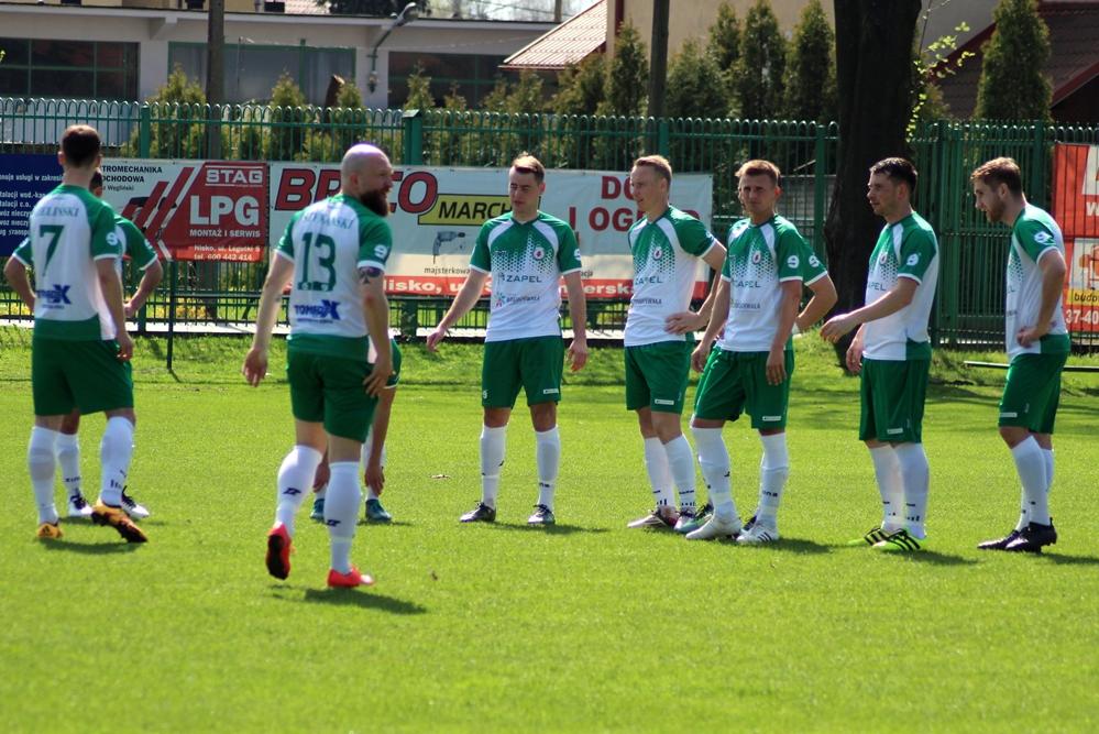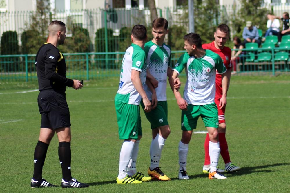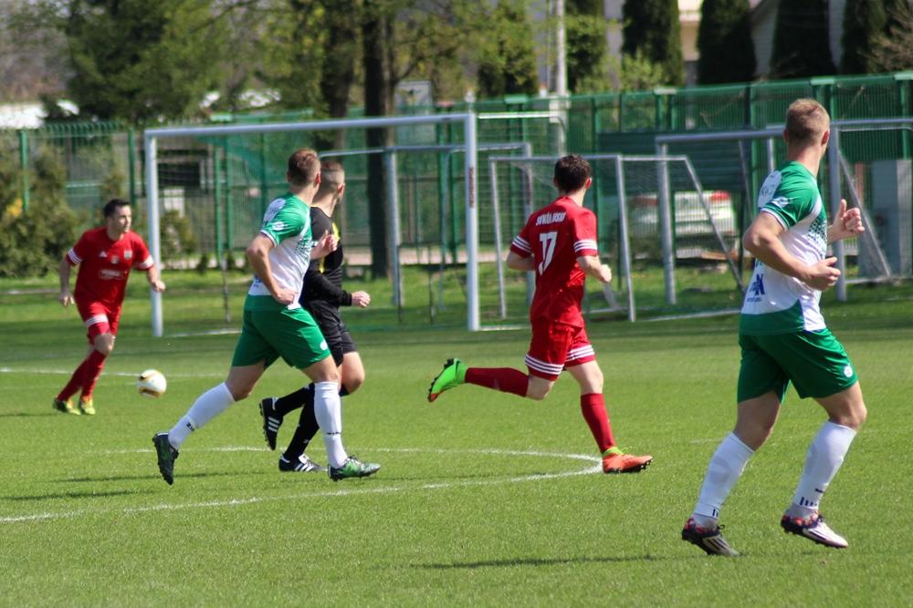 - 14.04.2018, Nisko: Piłkarze Izolatora Boguchwała (w zielono-białych strojach) pokonali 3-2 graczy Sokoła Nisko w meczu 23. kolejki rozgrywek 4 ligi podkarpackiej (fot. Radosław Kuśmierz)