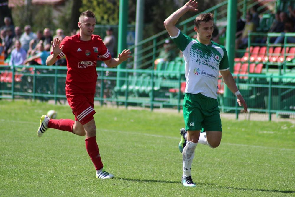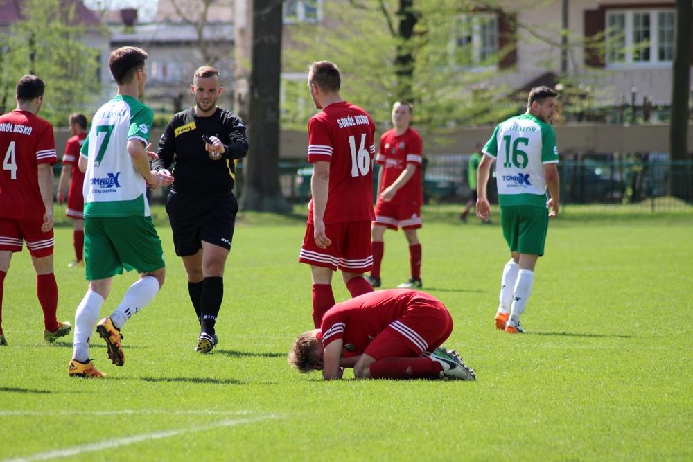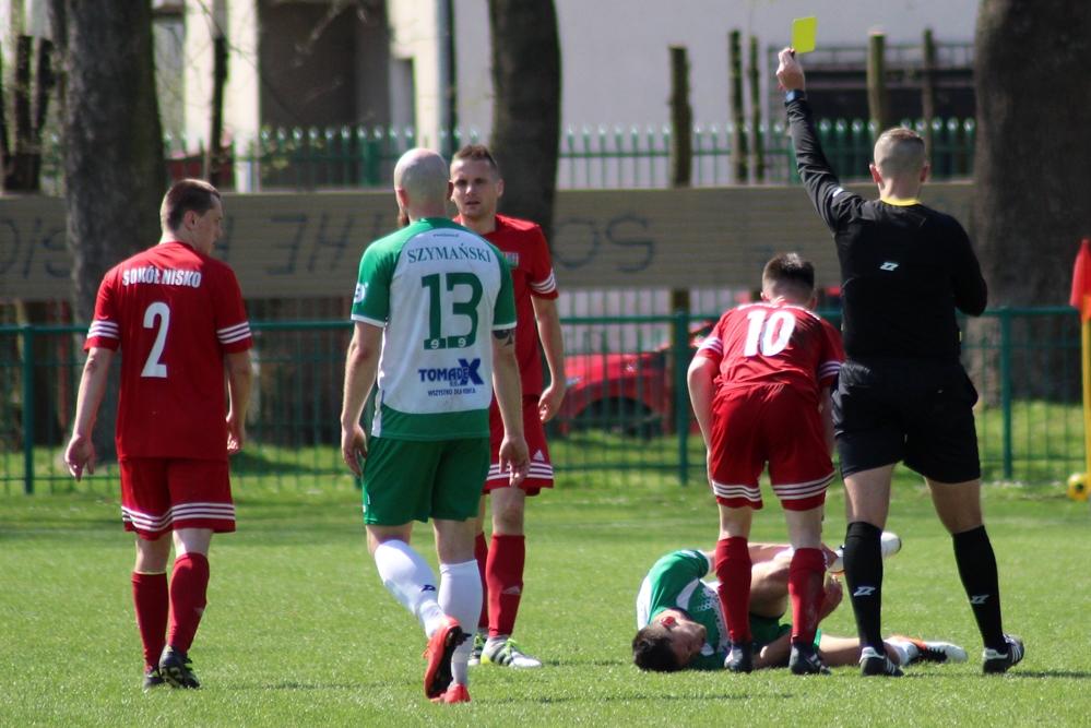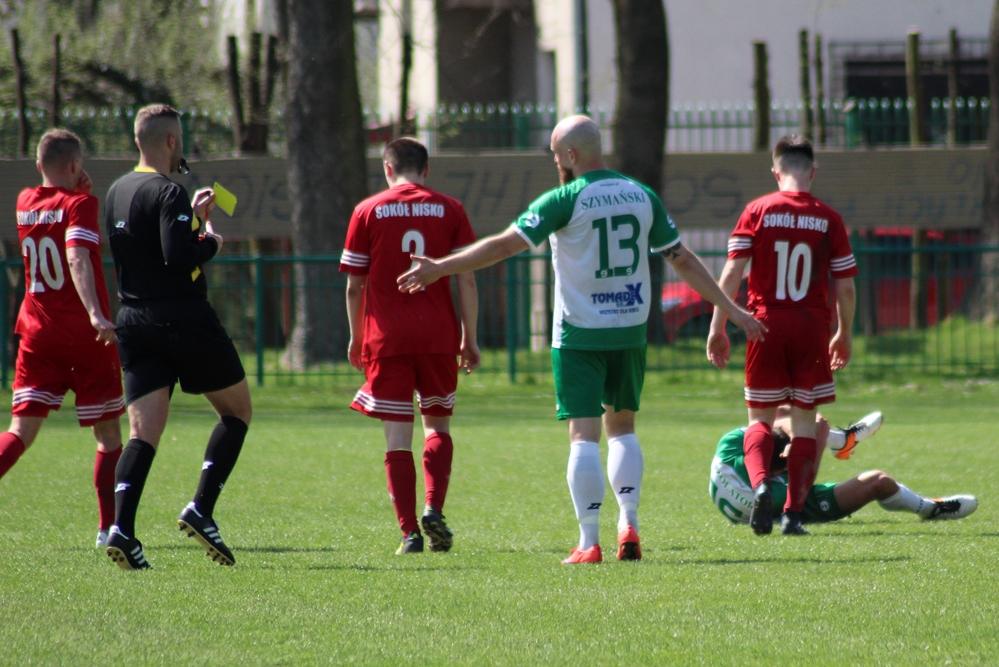 - 14.04.2018, Nisko: Piłkarze Izolatora Boguchwała (w zielono-białych strojach) pokonali 3-2 graczy Sokoła Nisko w meczu 23. kolejki rozgrywek 4 ligi podkarpackiej (fot. Radosław Kuśmierz)