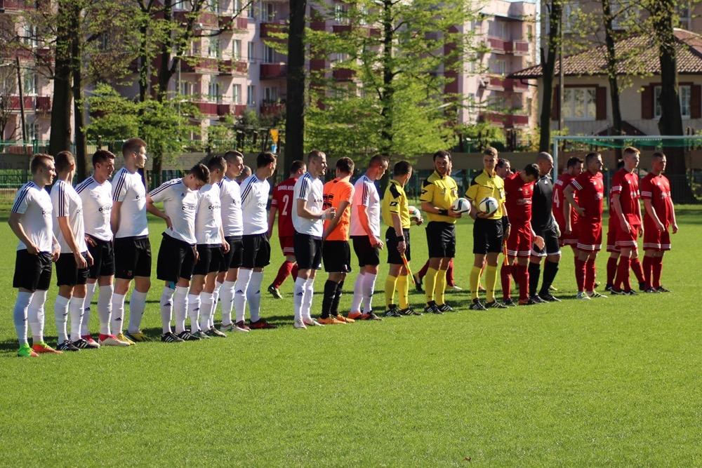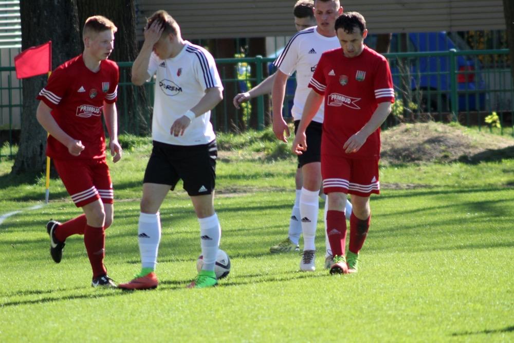 - 18.04.2019, Nisko: piłkarze Sokoła Nisko (w czerwonych koszulkach) wygrali 2-0 z Piastem Tuczempy w meczu zaległej kolejki rozgrywek 4 ligi podkarpackiej (fot. Radosław Kuśmierz)