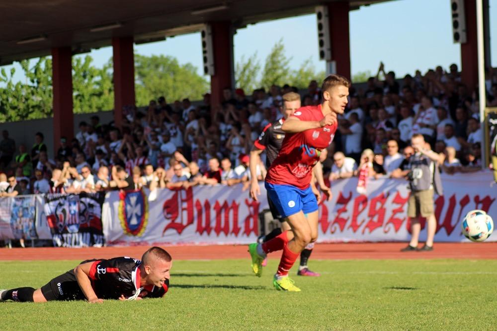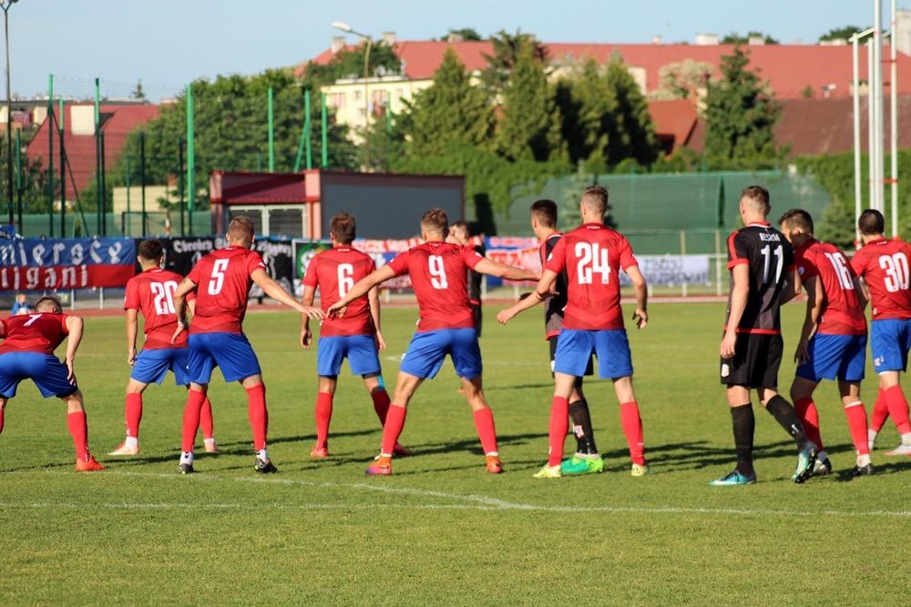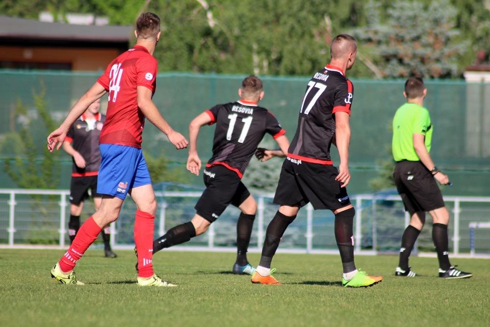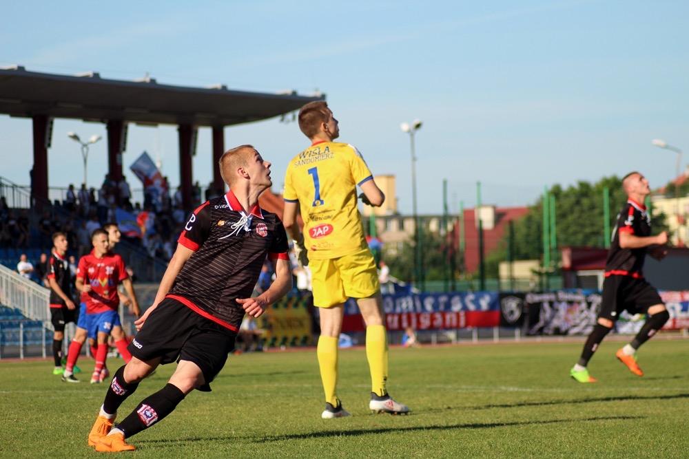 - 12 maja 2018, sobota: Resovia (czarne stroje) wygrała 3-0 w wyjazdowym meczu z Wisłą Sandomierz w spotkaniu rozegranych w ramach 28. kolejki 3 ligi grupy IV. Dzięki zwycięstwu rzeszowianie utrzymali pozycję lidera rozgrywek ze sporymi szansami na awans do 2 ligi (fot. Radosław Kuśmierz)