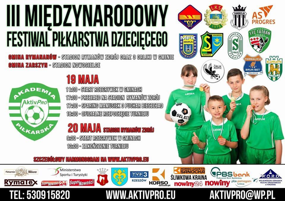 Stowarzyszenie Aktiv Pro po raz kolejny ma przyjemność organizować Międzynarodowy Festiwal Piłkarstwa Dziecięcego na terenie Gminy Rymanow oraz Gminy Zarszyn.