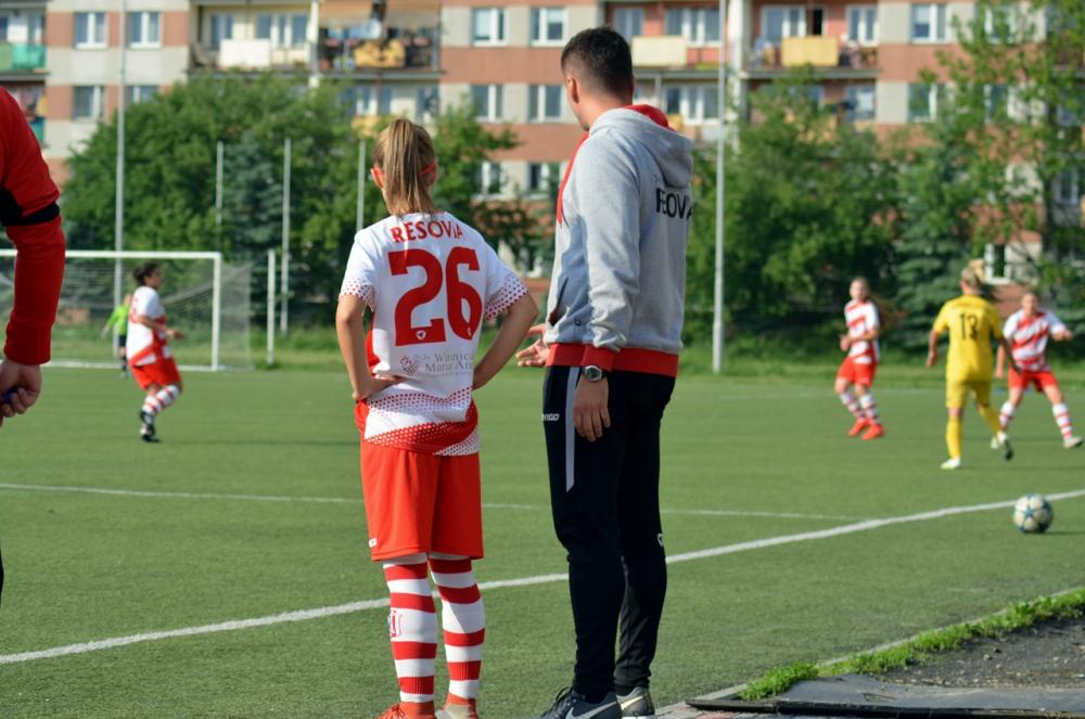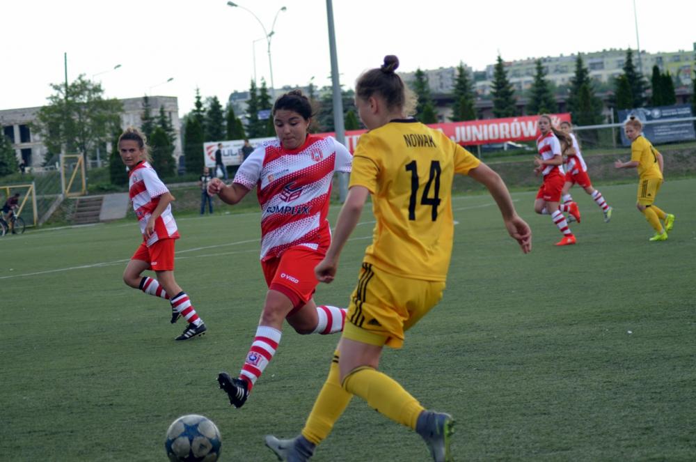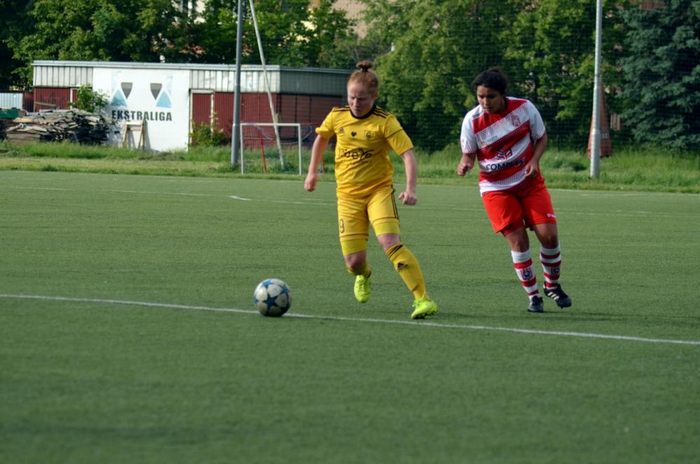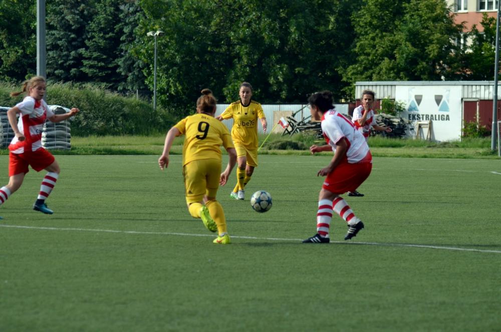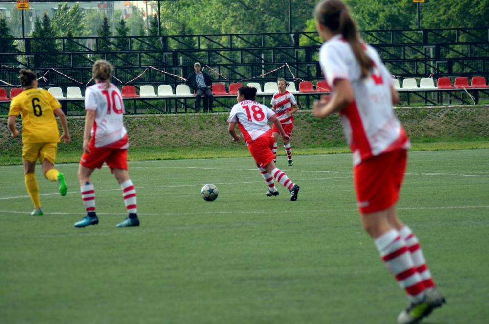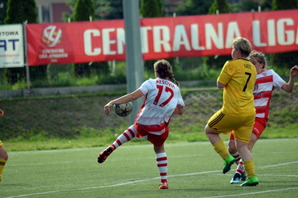 - Piłkarski Resovii (biało-czerwone stroje) zremisowały z GKS-em Katowice w meczu 1 ligi kobiet (fot. Adrianna Popkiewicz)
