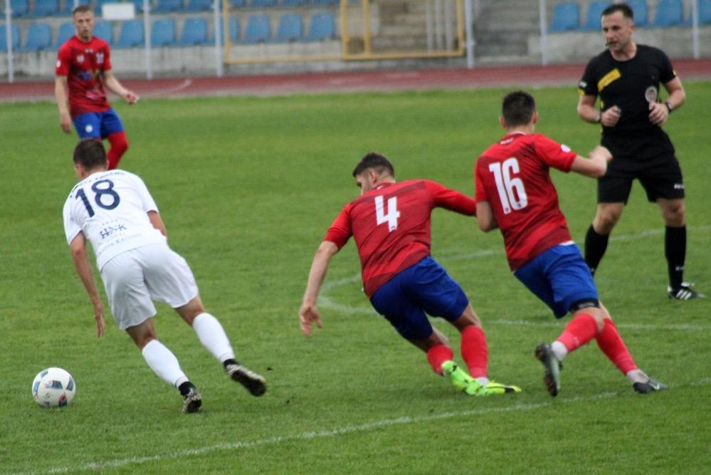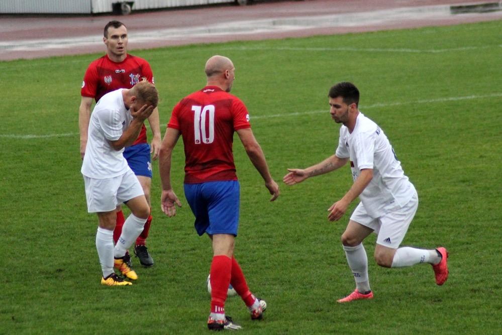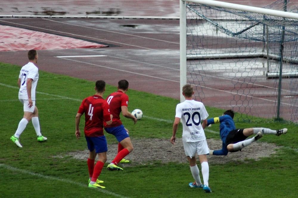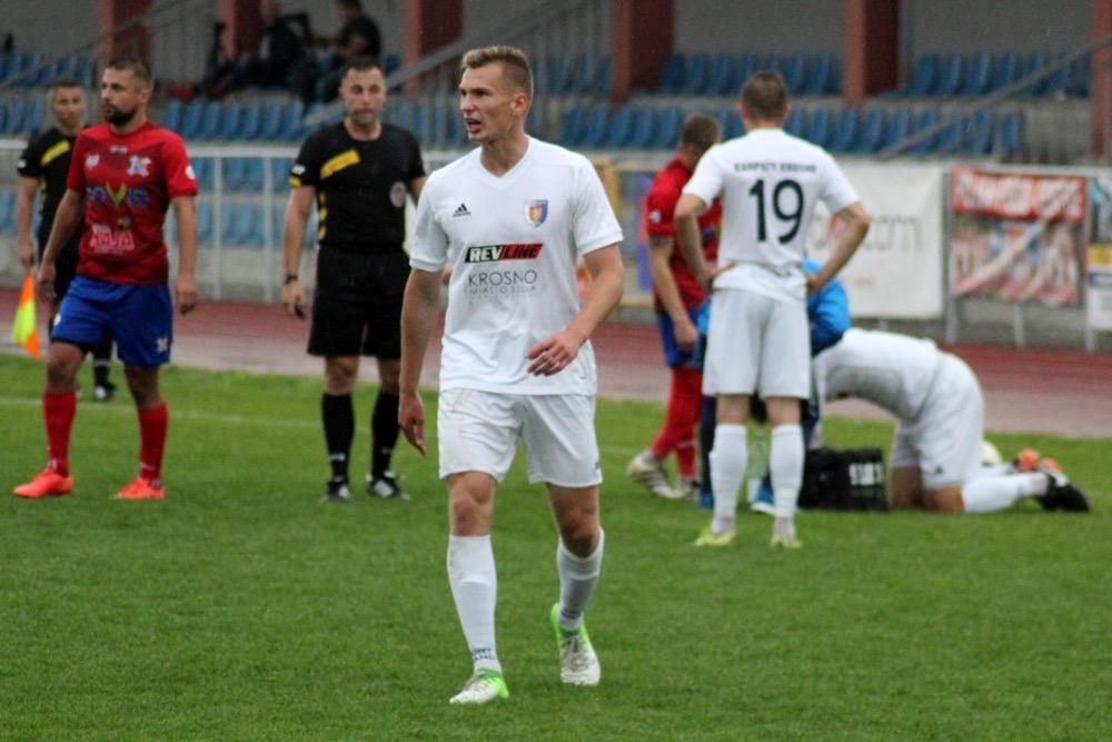 - Karpaty Krosno (biało-niebieskie stroje) przegrały w wyjazdowym pojedynku 3 ligi gr. IV z Wisłą Sandomierz 0-3 (fot. Radosław Kuśmierz)