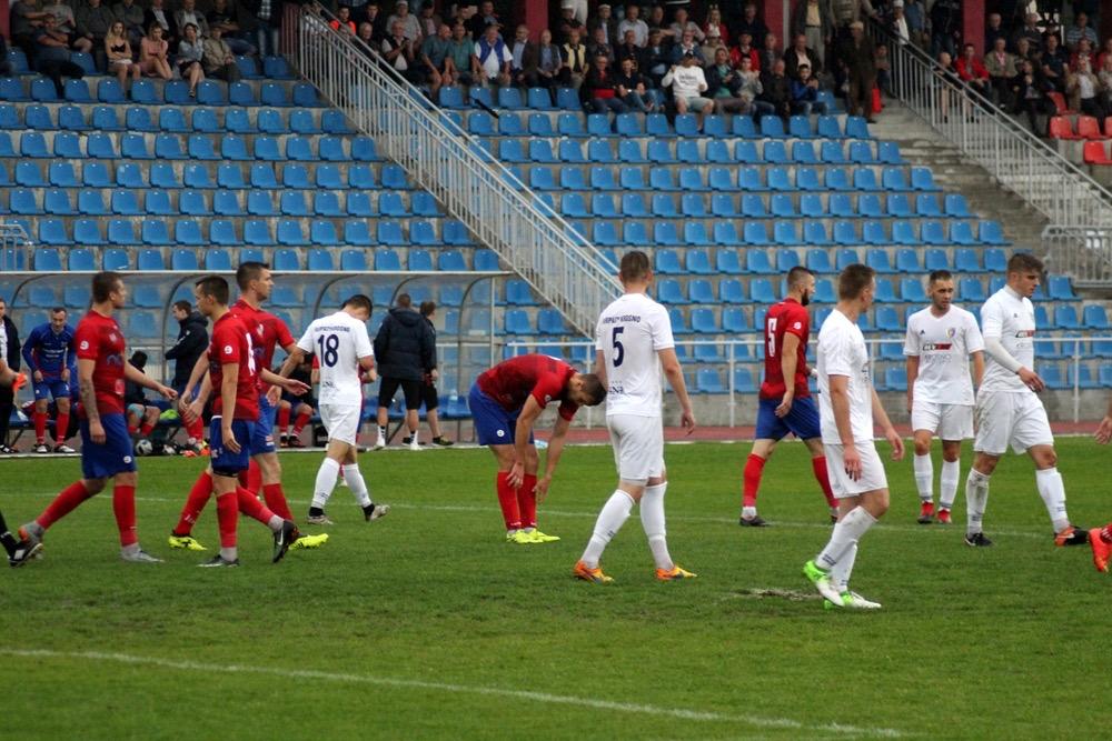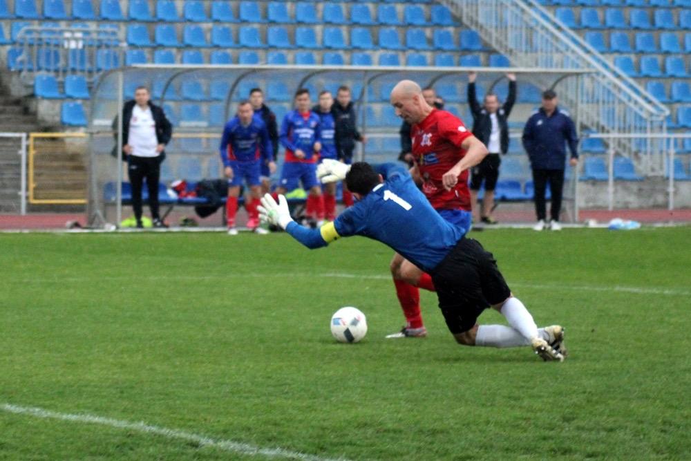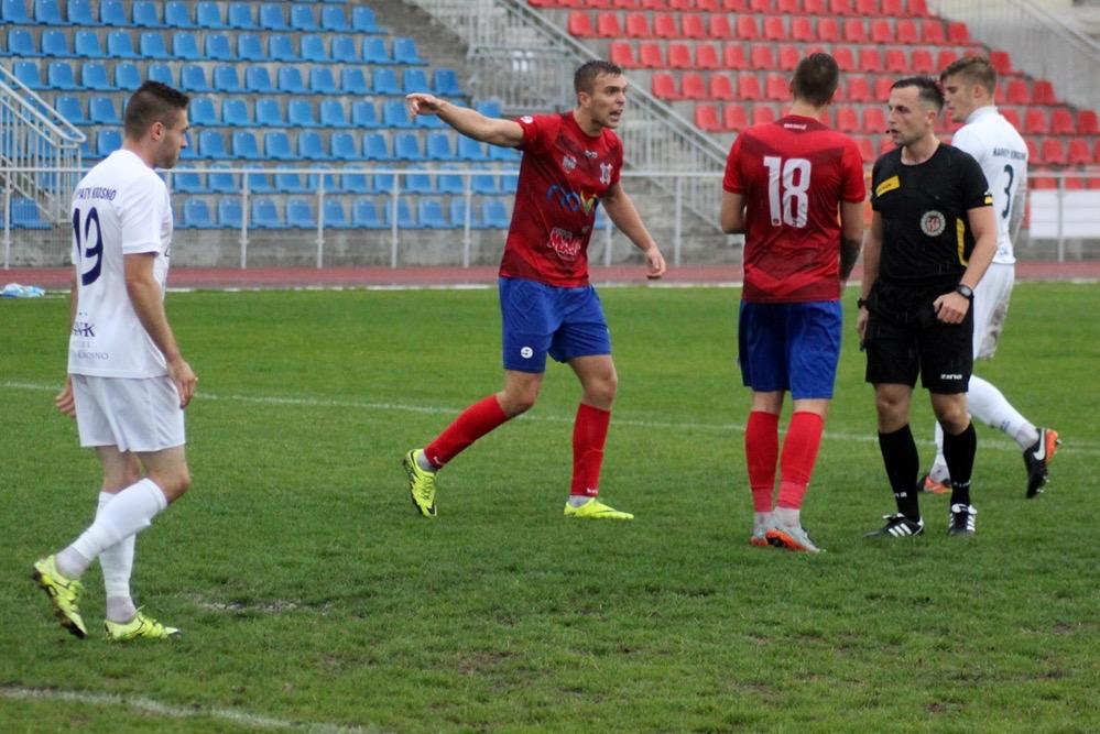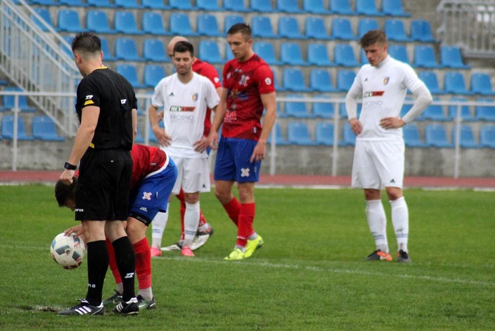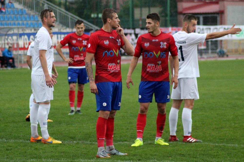 - Karpaty Krosno (biało-niebieskie stroje) przegrały w wyjazdowym pojedynku 3 ligi gr. IV z Wisłą Sandomierz 0-3 (fot. Radosław Kuśmierz)