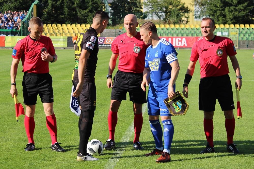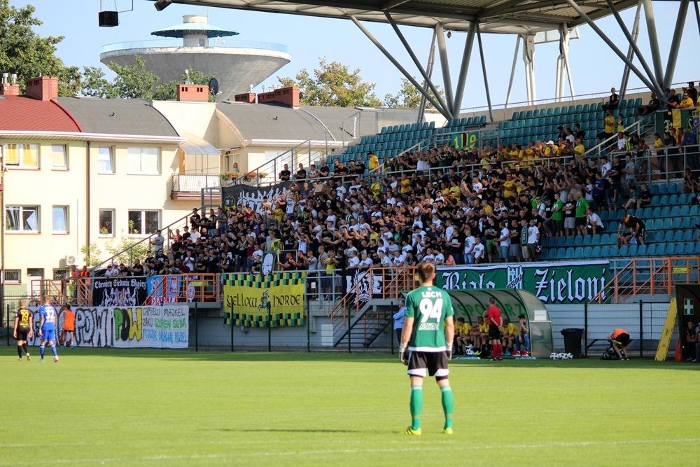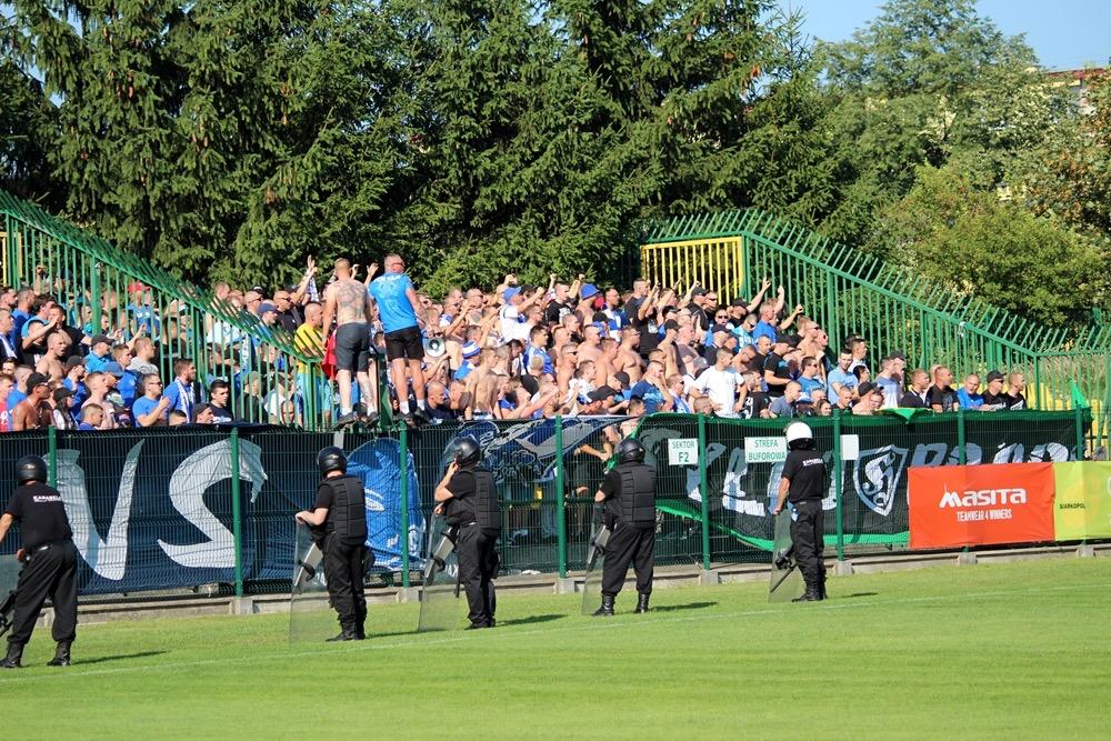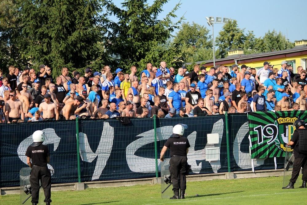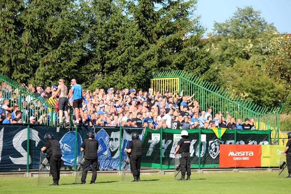- 21.07.2018, Tarnobrzeg: Piłkarze Siarki Tarnobrzeg (żółto-czarne stroje) wygrali z Ruchem Chorzów 1-0 w inauguracyjnym meczu 2 ligi rozegranym na Stadionie Miejskim w Tarnobrzegu. Na trybunach zasiadło sporo kibiców, tym 700-osobowa grupa fanów Ruchu (fot. Radosław Kuśmierz)