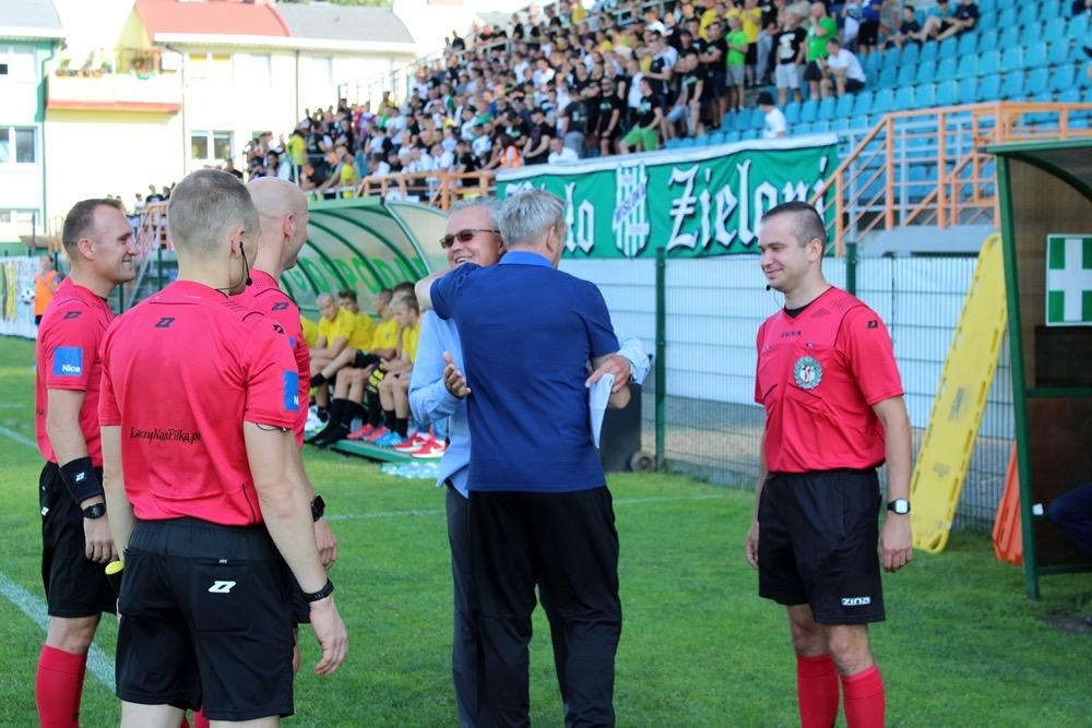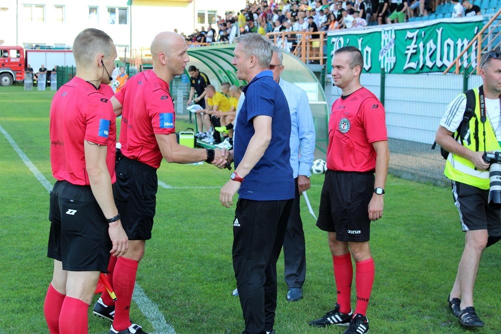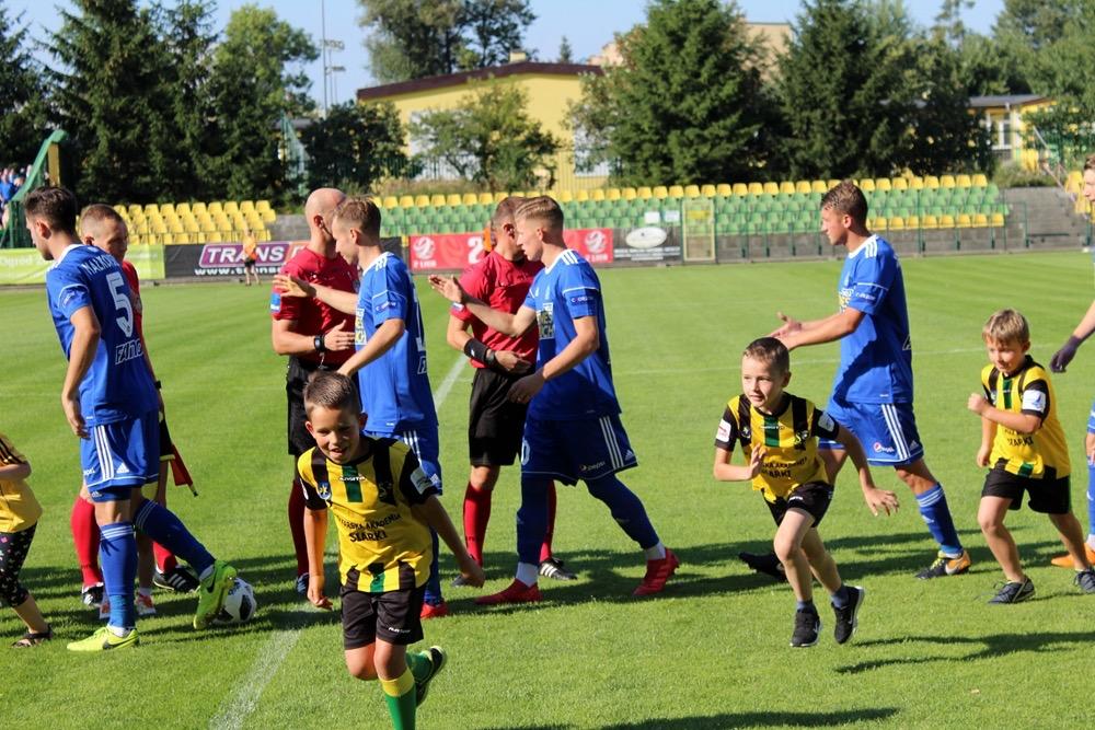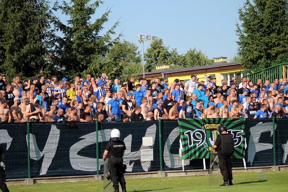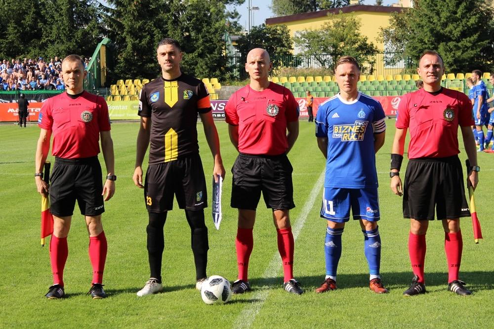 - 21.07.2018, Tarnobrzeg: Piłkarze Siarki Tarnobrzeg (żółto-czarne stroje) wygrali z Ruchem Chorzów 1-0 w inauguracyjnym meczu 2 ligi rozegranym na Stadionie Miejskim w Tarnobrzegu. Na trybunach zasiadło sporo kibiców, tym 700-osobowa grupa fanów Ruchu (fot. Radosław Kuśmierz)