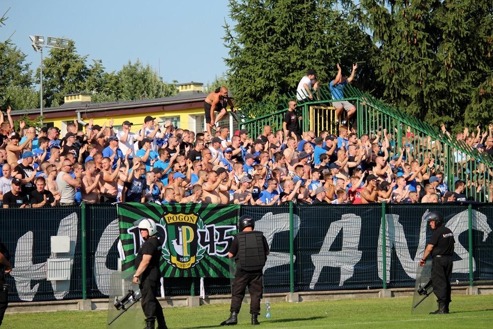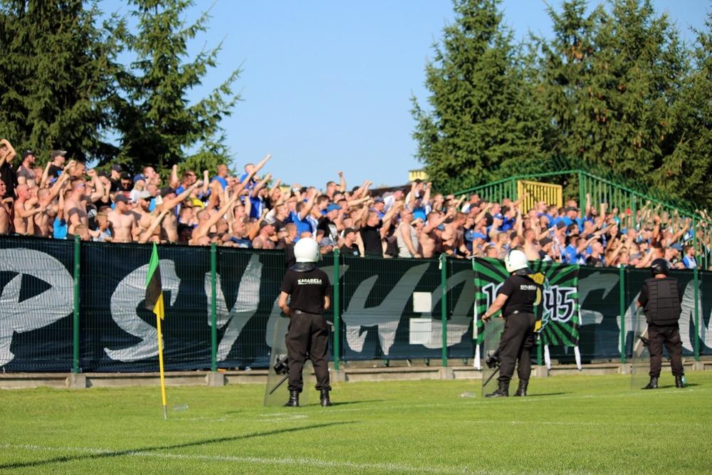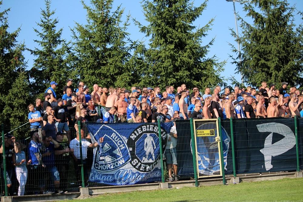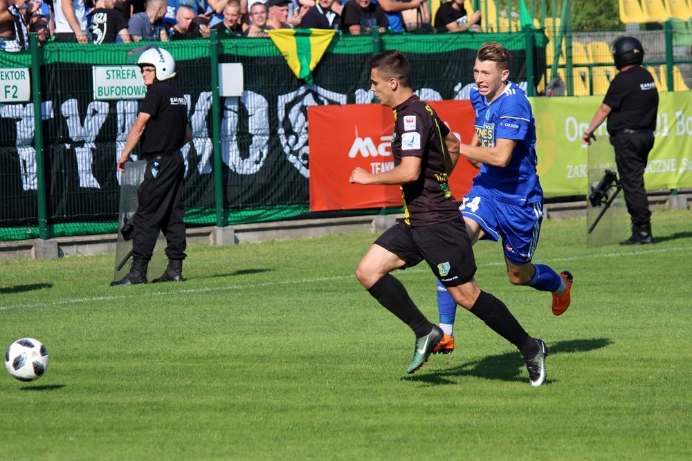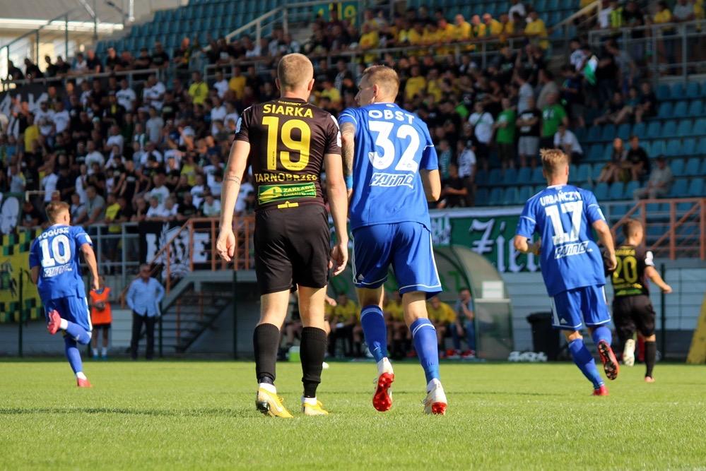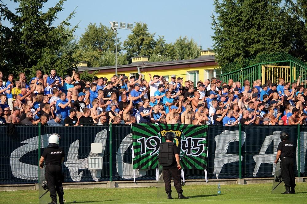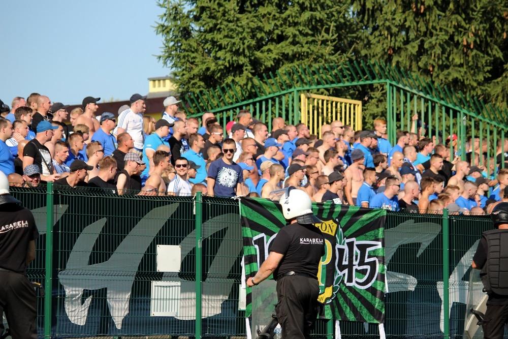- 21.07.2018, Tarnobrzeg: Piłkarze Siarki Tarnobrzeg (żółto-czarne stroje) wygrali z Ruchem Chorzów 1-0 w inauguracyjnym meczu 2 ligi rozegranym na Stadionie Miejskim w Tarnobrzegu. Na trybunach zasiadło sporo kibiców, tym 700-osobowa grupa fanów Ruchu (fot. Radosław Kuśmierz)