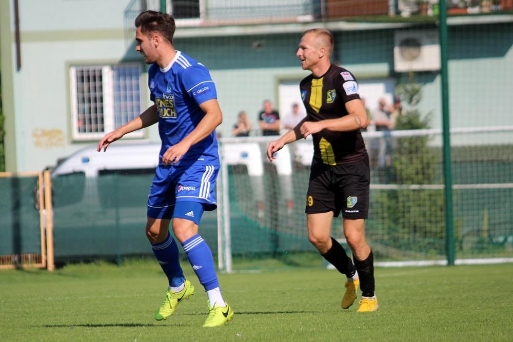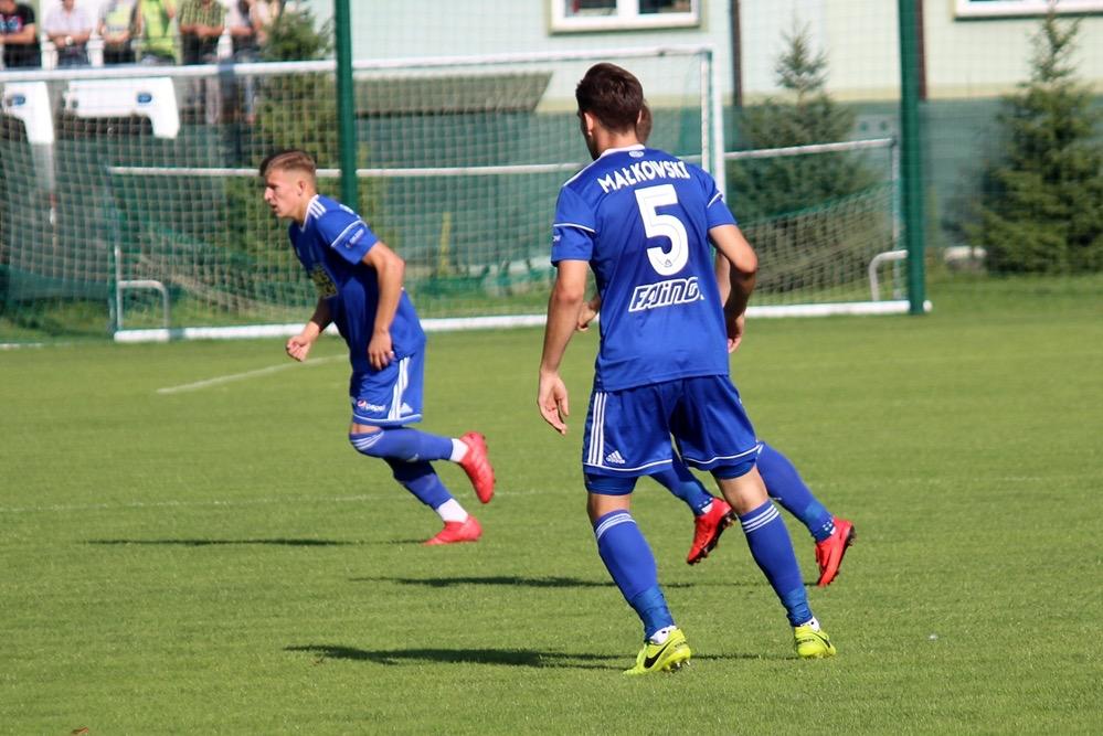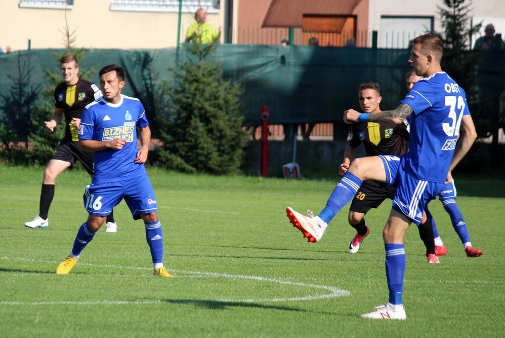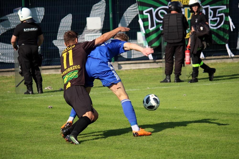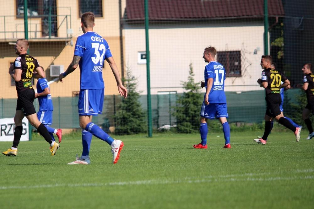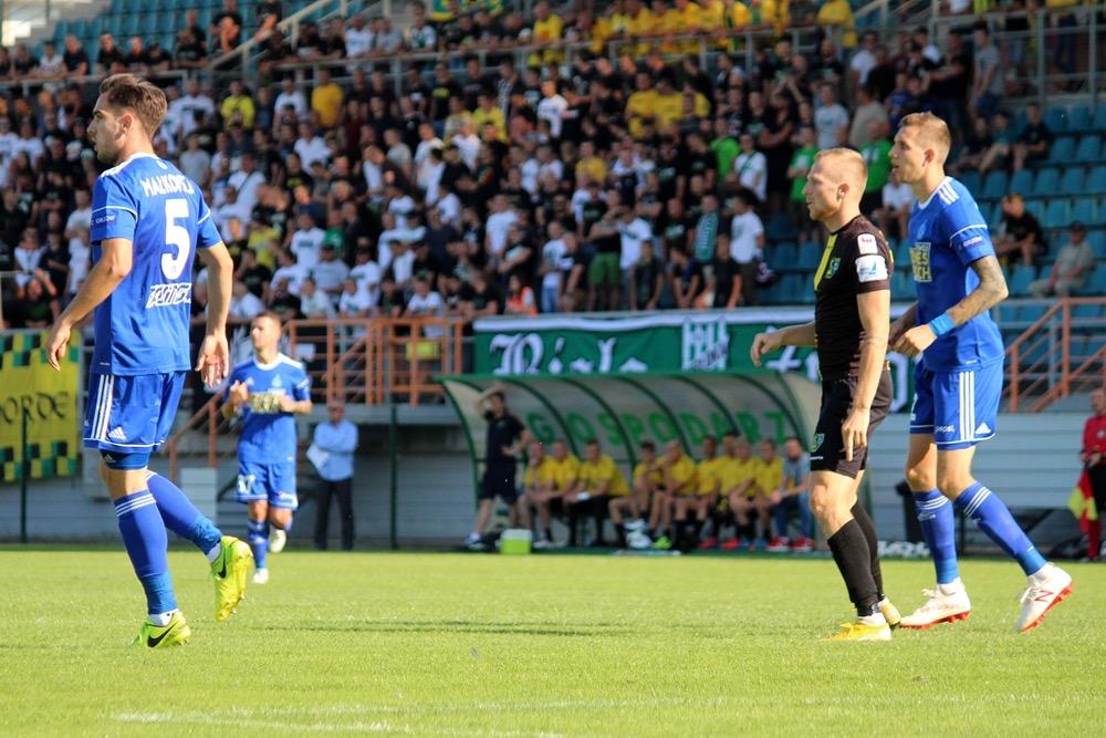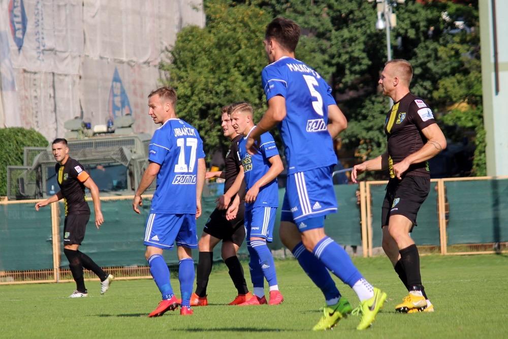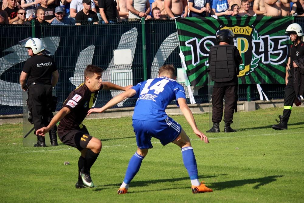 - 21.07.2018, Tarnobrzeg: Piłkarze Siarki Tarnobrzeg (żółto-czarne stroje) wygrali z Ruchem Chorzów 1-0 w inauguracyjnym meczu 2 ligi rozegranym na Stadionie Miejskim w Tarnobrzegu. Na trybunach zasiadło sporo kibiców, tym 700-osobowa grupa fanów Ruchu (fot. Radosław Kuśmierz)