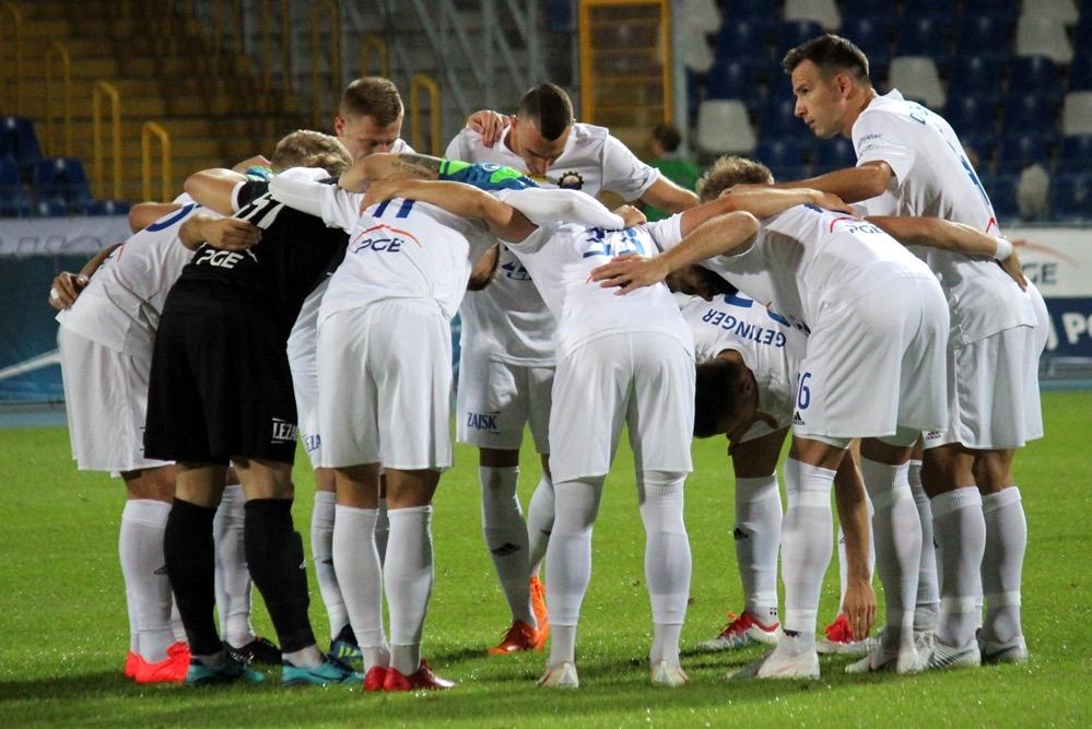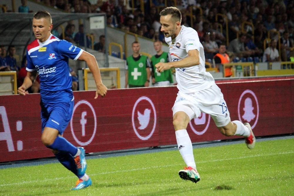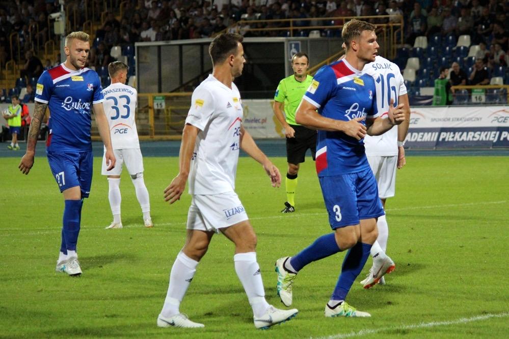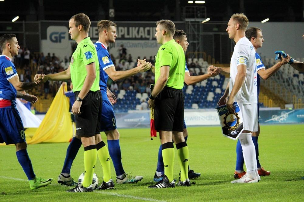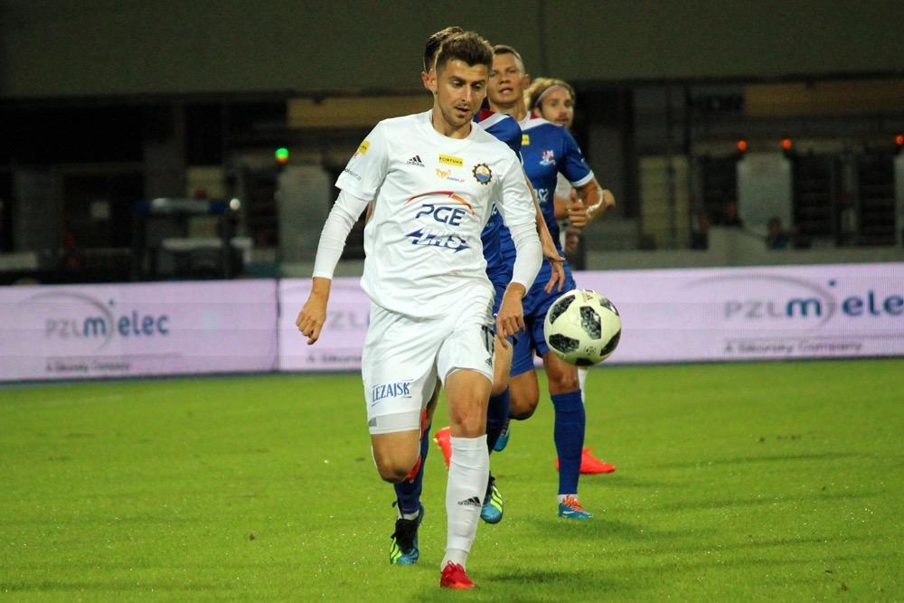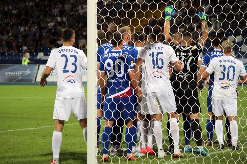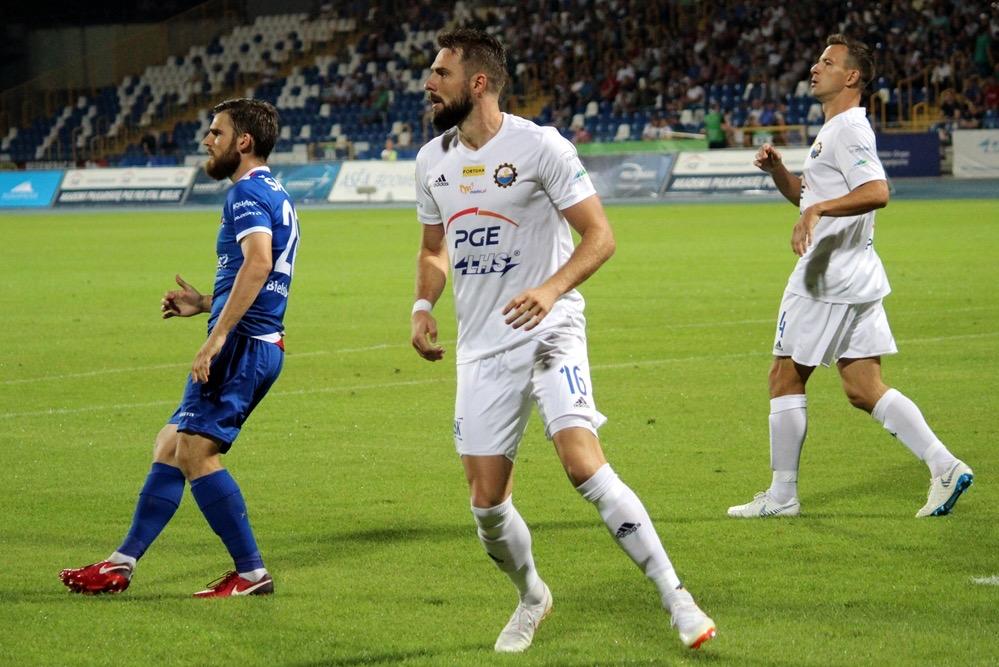 - 17.08.2018, Mielec: W meczu 1 ligi piłkarze Stali Mielec (białe stroje) ulegli przed własną publicznością Podbeskidziu Bielsko-Biała. Mecz zakończył się wygraną goście 1-0 (fot. Radosław Kuśmierz).