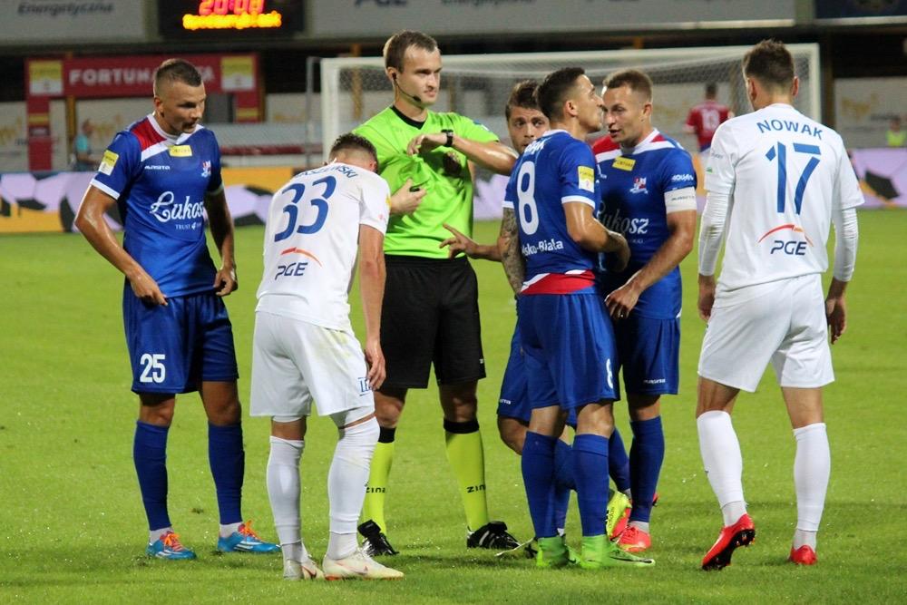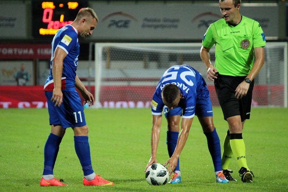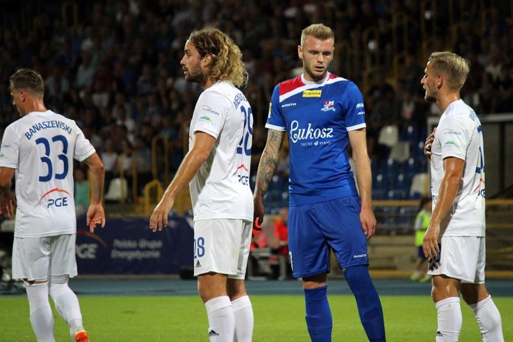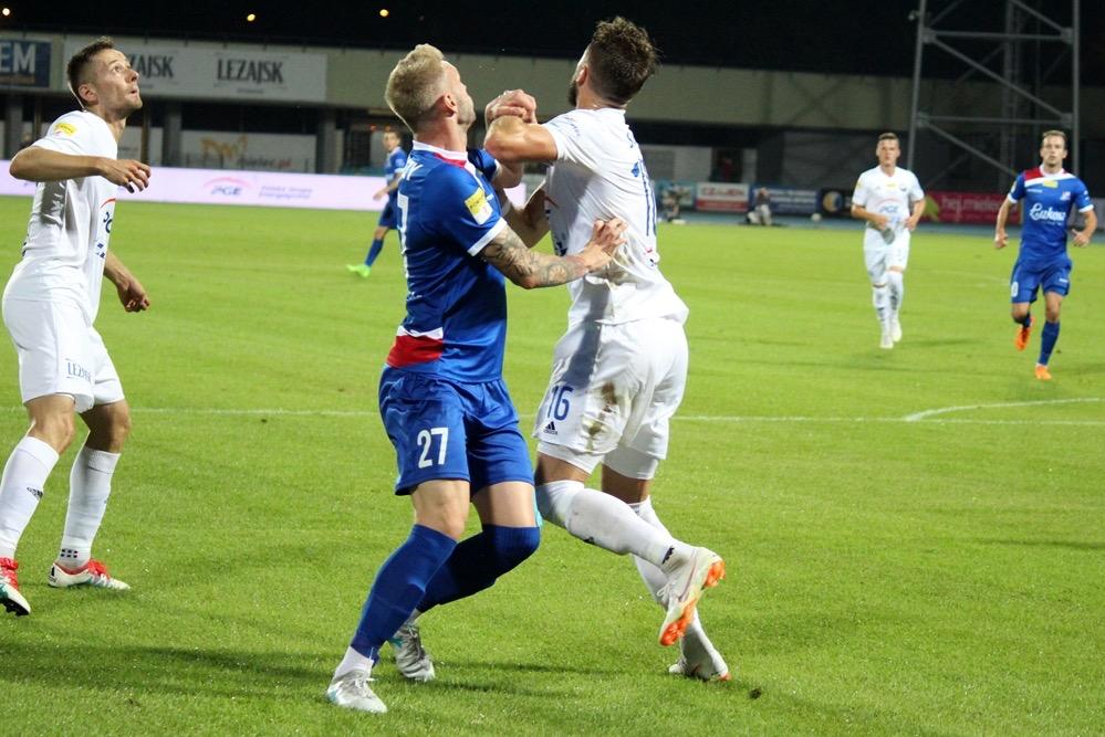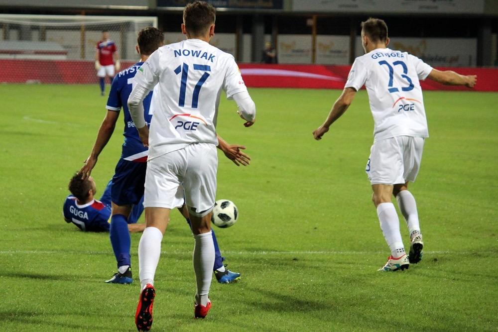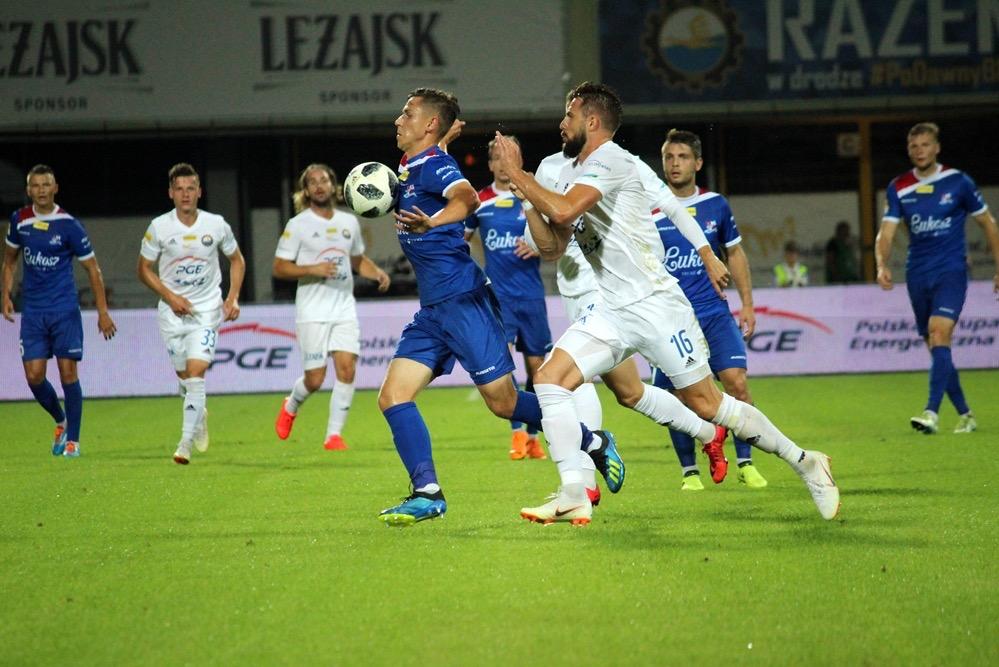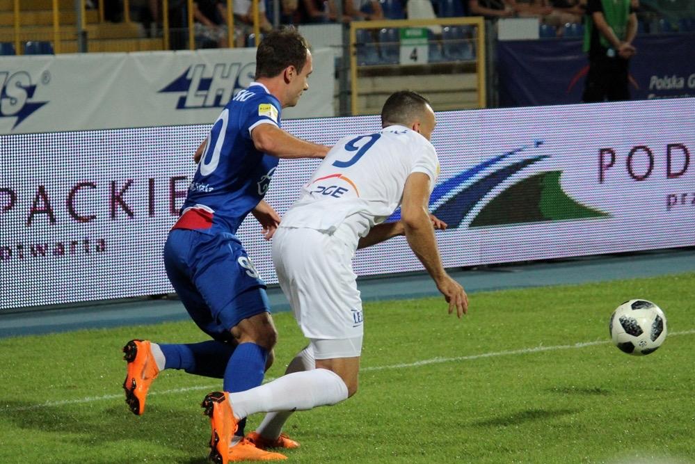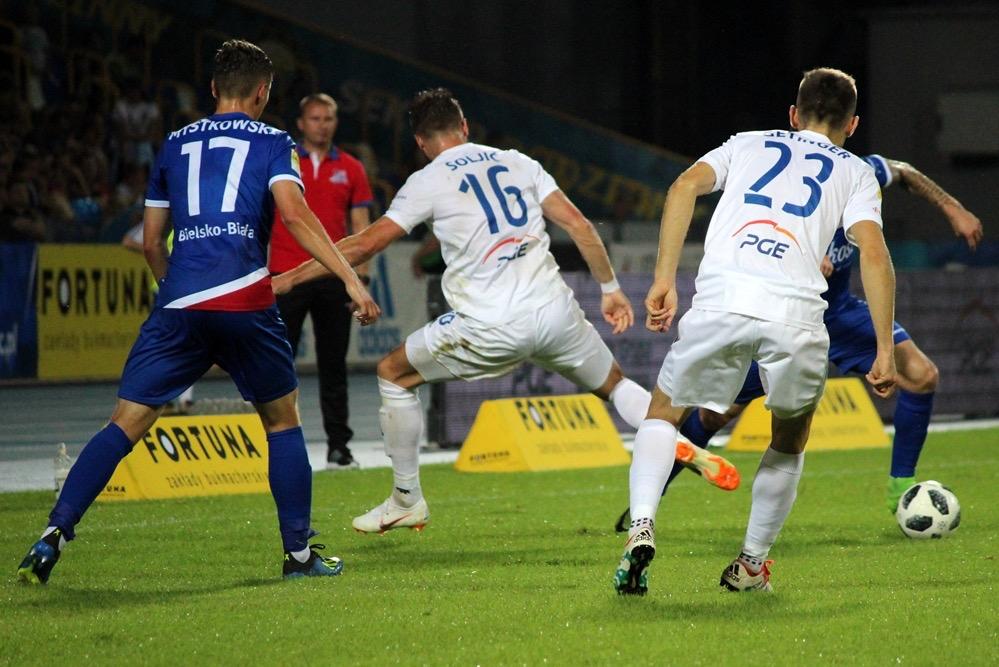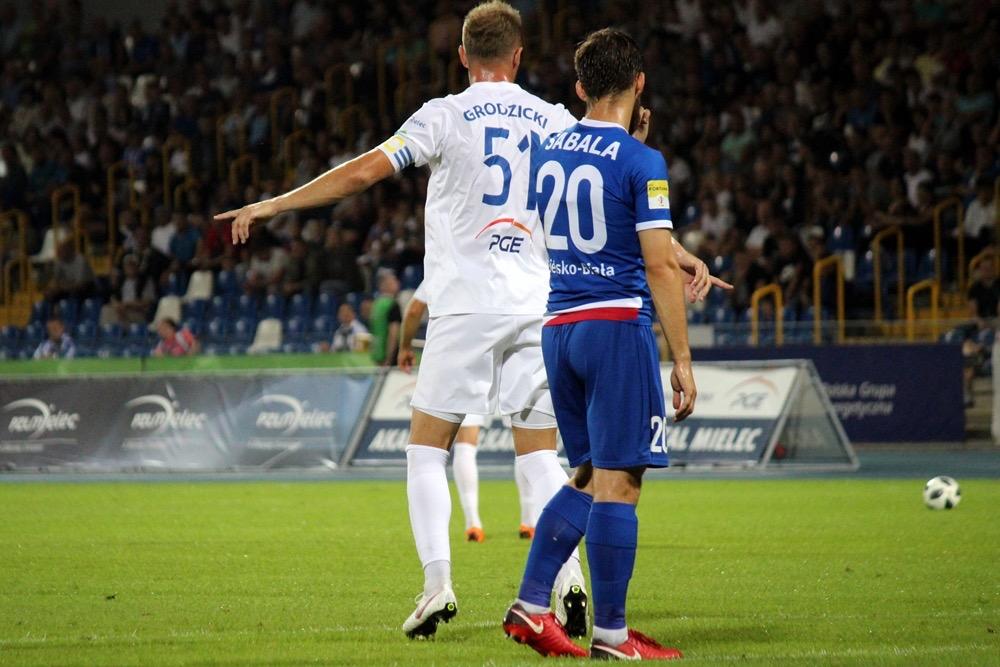 - 17.08.2018, Mielec: W meczu 1 ligi piłkarze Stali Mielec (białe stroje) ulegli przed własną publicznością Podbeskidziu Bielsko-Biała. Mecz zakończył się wygraną goście 1-0 (fot. Radosław Kuśmierz).