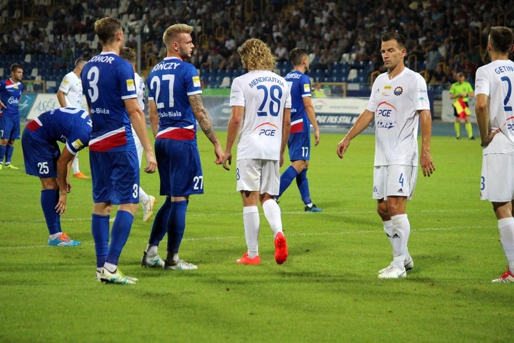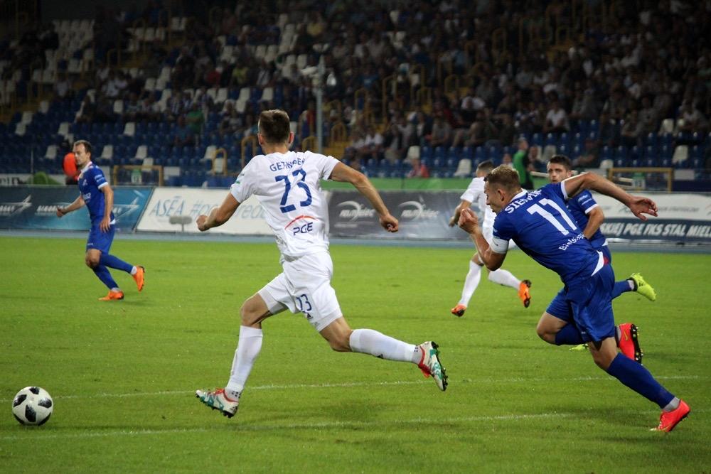 - 17.08.2018, Mielec: W meczu 1 ligi piłkarze Stali Mielec (białe stroje) ulegli przed własną publicznością Podbeskidziu Bielsko-Biała. Mecz zakończył się wygraną goście 1-0 (fot. Radosław Kuśmierz).