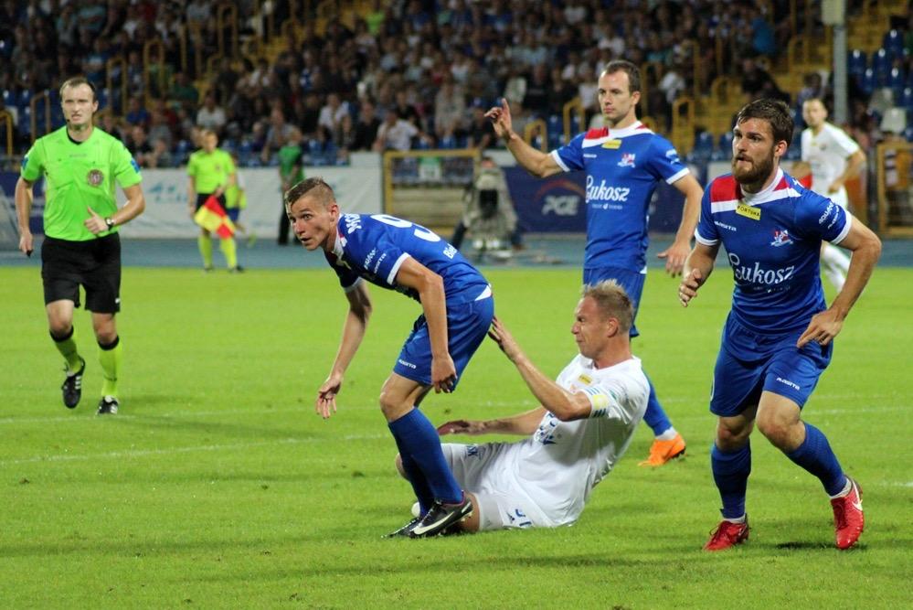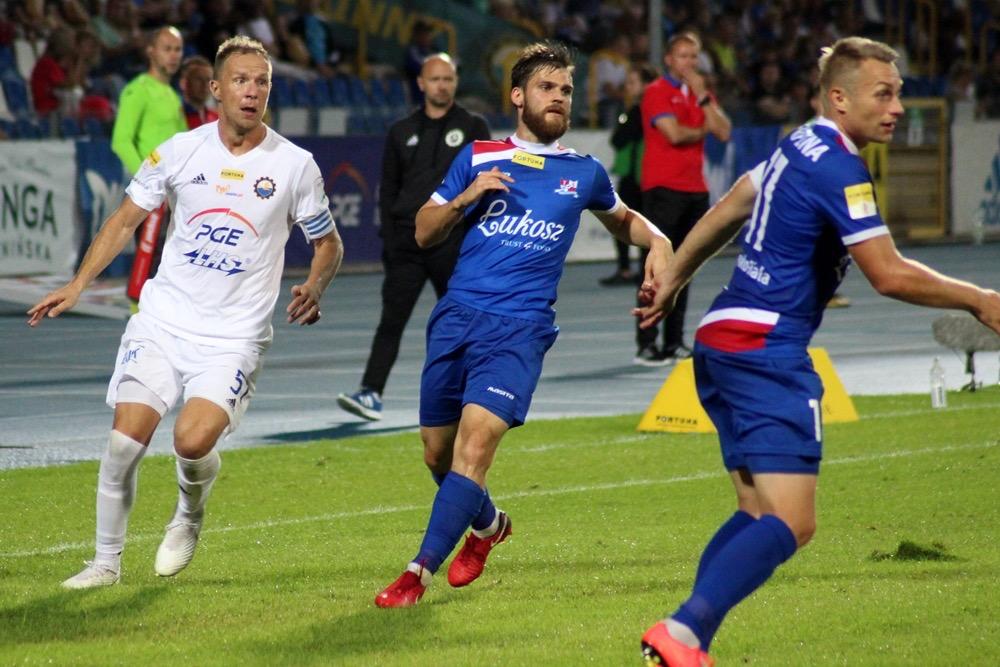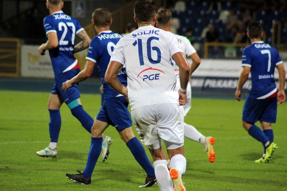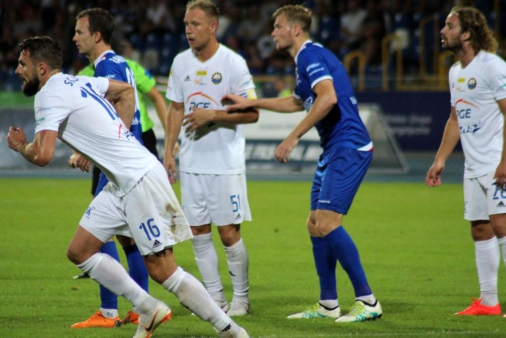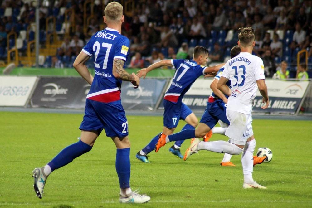 - 17.08.2018, Mielec: W meczu 1 ligi piłkarze Stali Mielec (białe stroje) ulegli przed własną publicznością Podbeskidziu Bielsko-Biała. Mecz zakończył się wygraną goście 1-0 (fot. Radosław Kuśmierz).