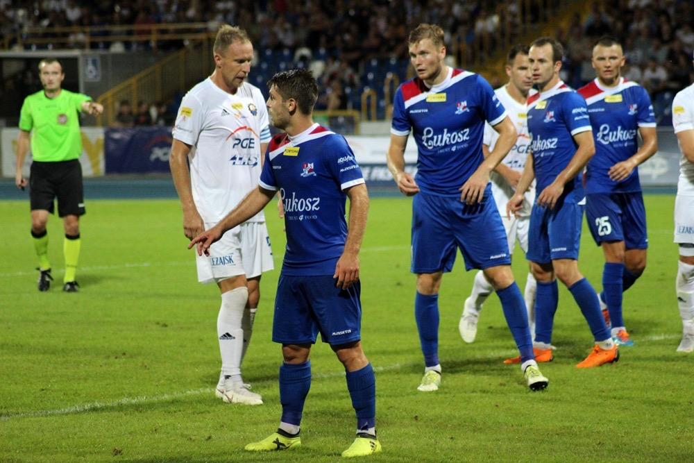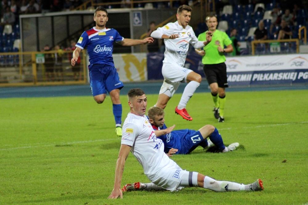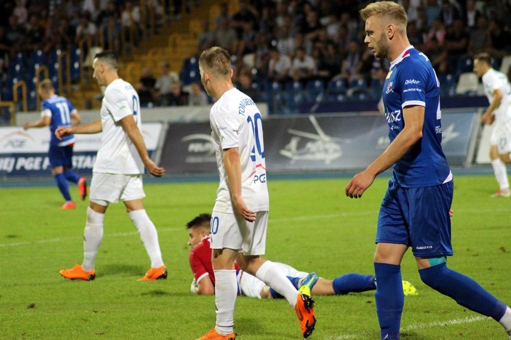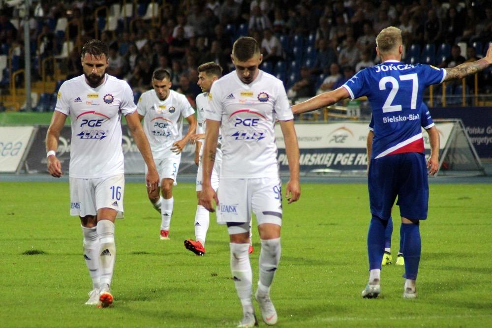 - 17.08.2018, Mielec: W meczu 1 ligi piłkarze Stali Mielec (białe stroje) ulegli przed własną publicznością Podbeskidziu Bielsko-Biała. Mecz zakończył się wygraną goście 1-0 (fot. Radosław Kuśmierz).