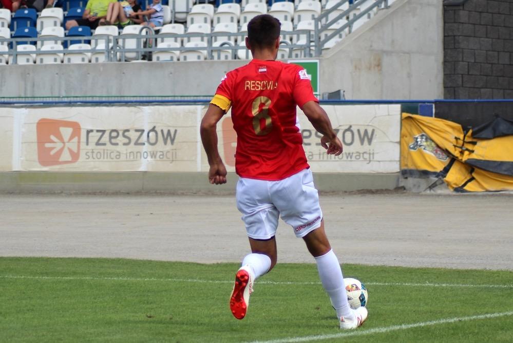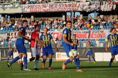 Chwilę później Resovia zdobyła bramkę. Najpierw jeden z zawodników "Pasiaków" trafił w poprzeczkę, a dobijający był na pozycji spalonej. W końcówce pierwszej połowy mocniej zaatakowali podopieczni Szymona Grabowskiego, ale swoje sytuacje zmarnowali Kamil Antonik i Mateusz Kantor.