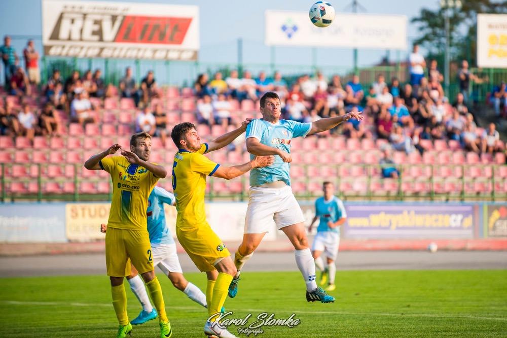 - 29.08.2018, Krosno. Piłkarze Ekoball Stali Sanok (żółte stroje) wygrali na wyjeździe w meczu derbowym z Karpatami Krosno. Spotkanie zakończyło się wynikiem 1-0 (fot. Karol Słomka)