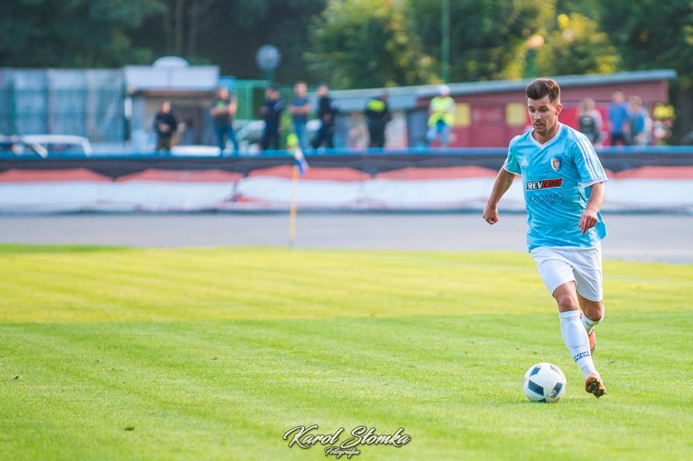 - 29.08.2018, Krosno. Piłkarze Ekoball Stali Sanok (żółte stroje) wygrali na wyjeździe w meczu derbowym z Karpatami Krosno. Spotkanie zakończyło się wynikiem 1-0 (fot. Karol Słomka)