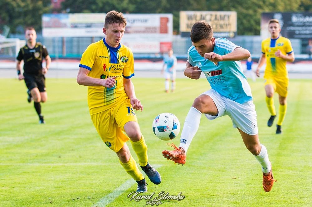- 29.08.2018, Krosno. Piłkarze Ekoball Stali Sanok (żółte stroje) wygrali na wyjeździe w meczu derbowym z Karpatami Krosno. Spotkanie zakończyło się wynikiem 1-0 (fot. Karol Słomka)