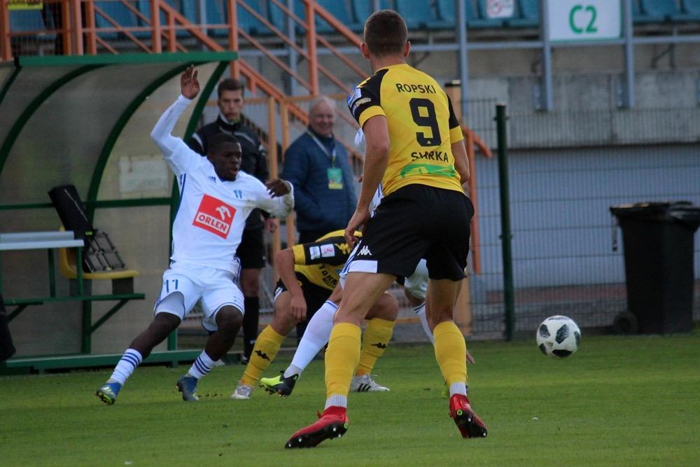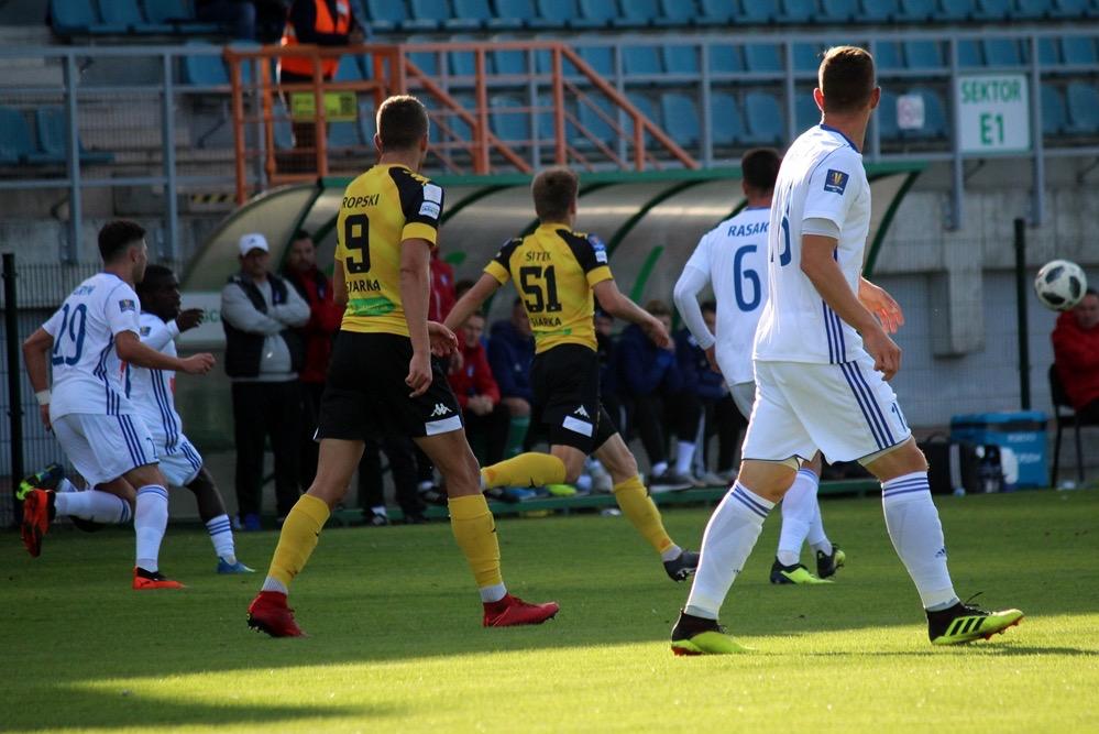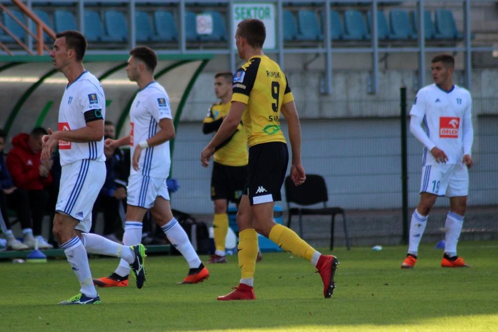 - Stadion Miejski w Tarnobrzegu, 25.09.2018: piłkarze Siarki Tarnobrzeg (żółto-czarne stroje) przegrali przed własną publicznością z ekstraklasową Wisłą Płock w meczu I rundy Pucharu Polski. "Siarkowcy" ulegli Wiśle 1-4 odpadając z dalszej rywalizacji (fot. Radosław Kuśmierz)