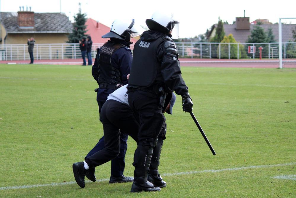 - 03.10.2018, Sandomierz: Podczas meczu Pucharu Polski w Sandomierzu w którym trzecioligowa Wisła zmierzyła się z ekstraklasową Koroną Kielce doszło do zamieszek. Kibice Wisły Sandomierz wybiegli na boisko, a mecz został przerwany na blisko 30 minut. Interweniować musiała policja (fot. Karol Twardowski)